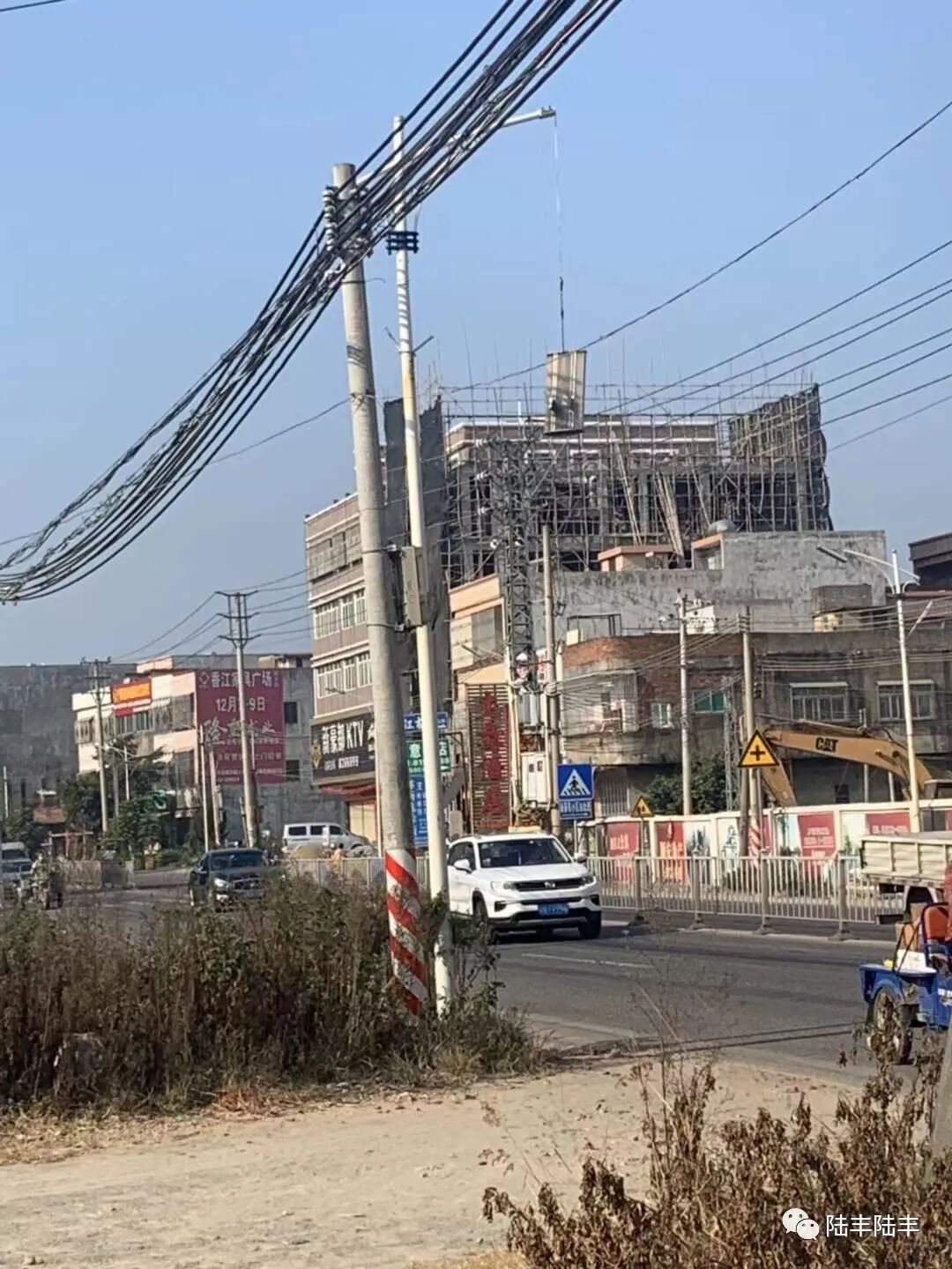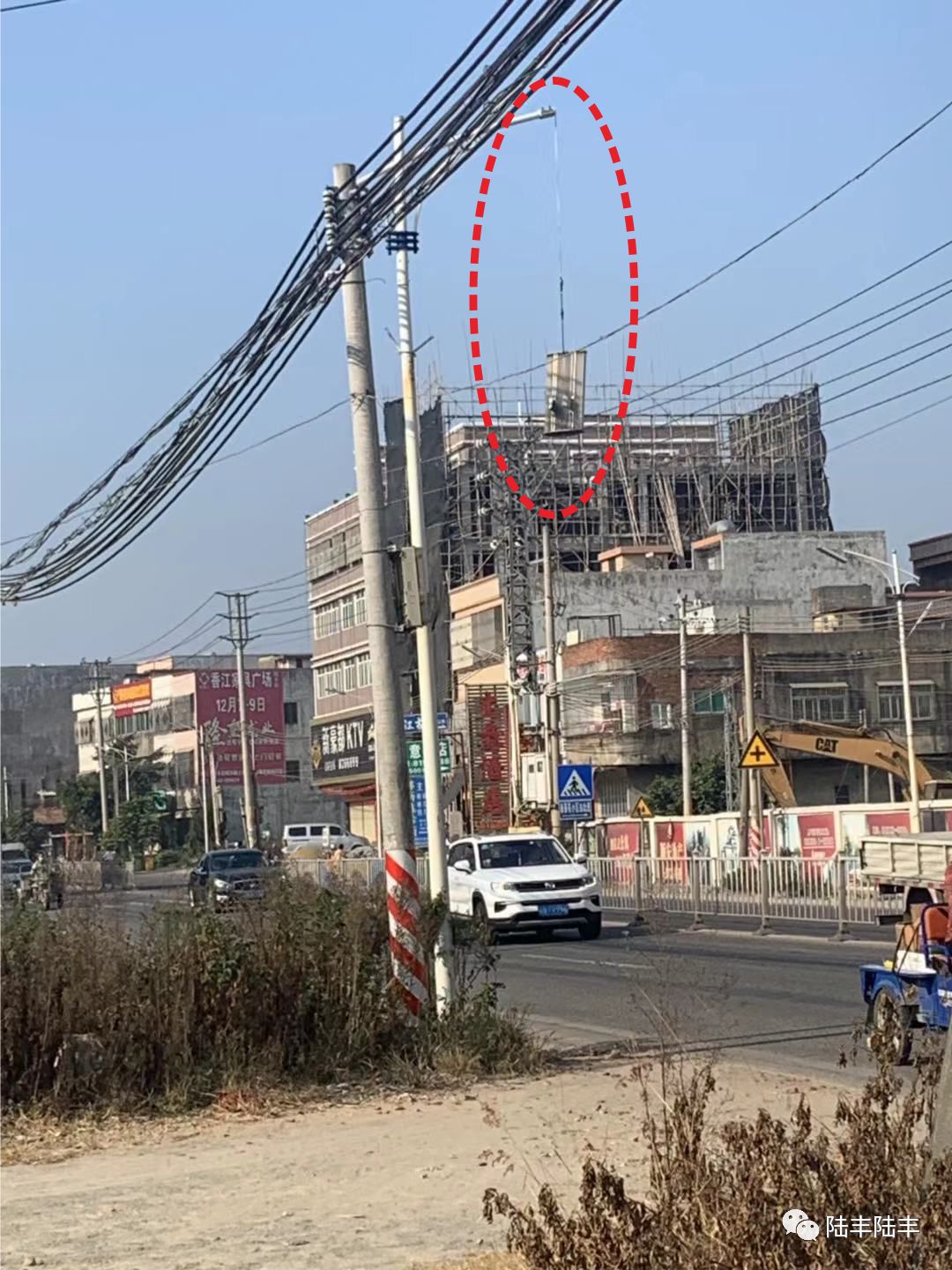 国道G324陆丰博美路旁,据网友称:顺豪苑对面有一盏路灯坏了,就要掉下来了,此盏路灯危险!!!该路灯看似藕断丝连,这是怎么回事?