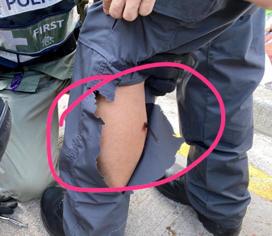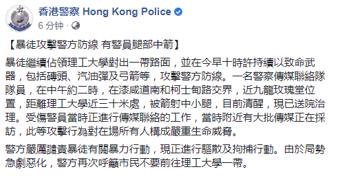 (警察传媒联络队(FMLC)队员中箭,图源:香港警察脸书)