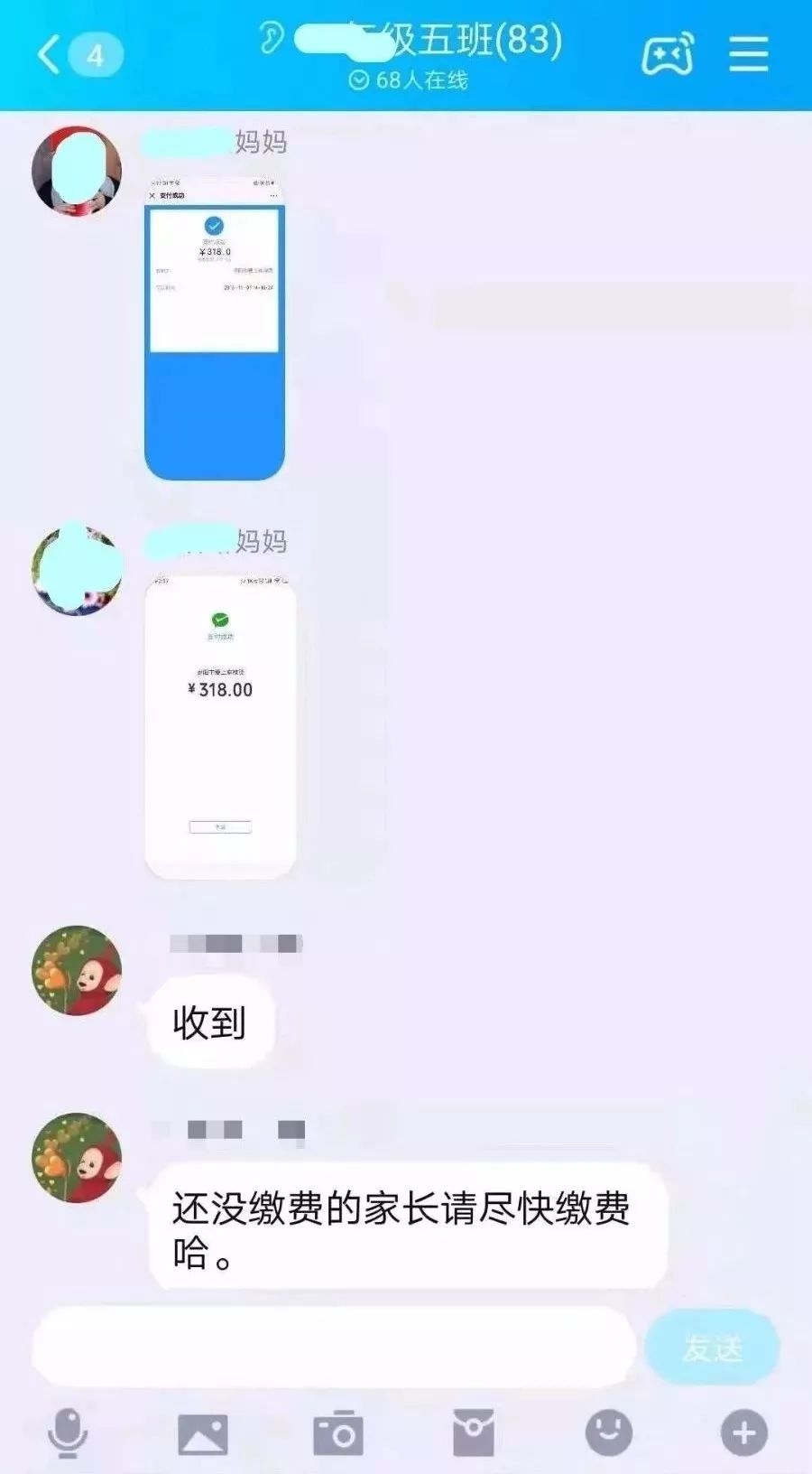 该qq群中,“班主任”要求收取318元的资料费,并发来一个商户收款二维码,还表示微信支付宝均可转账。