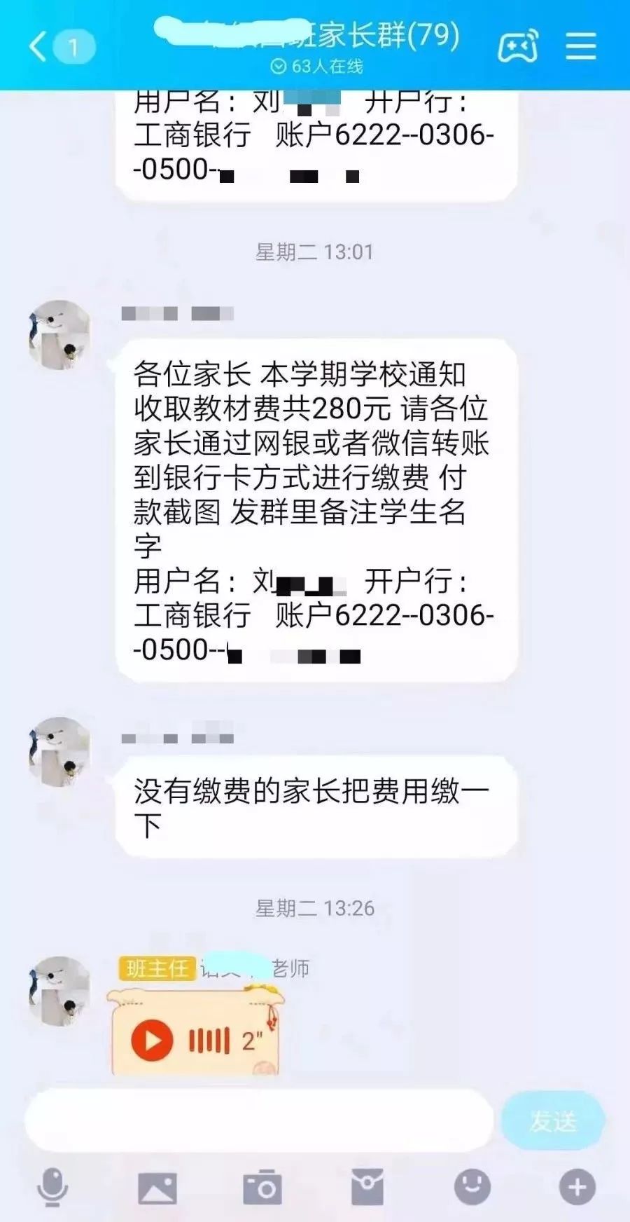 该家长群中,“班主任”要求收取280元的教材费,并发来了收款账户和开户名。