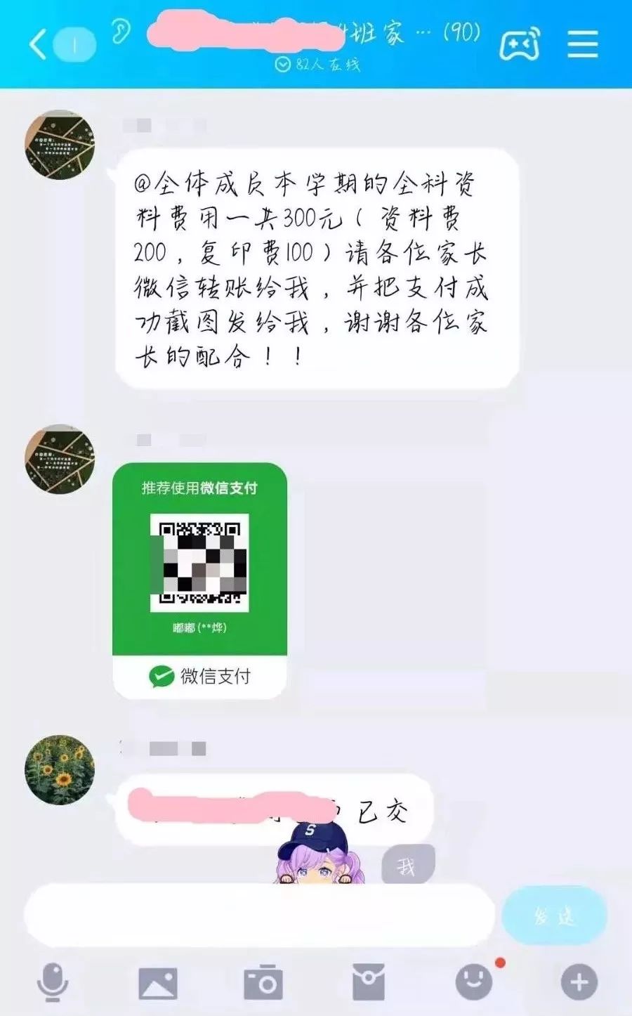 该家长群中,“班主任”要求收取300元材料费,并直接发来收款二维码。
