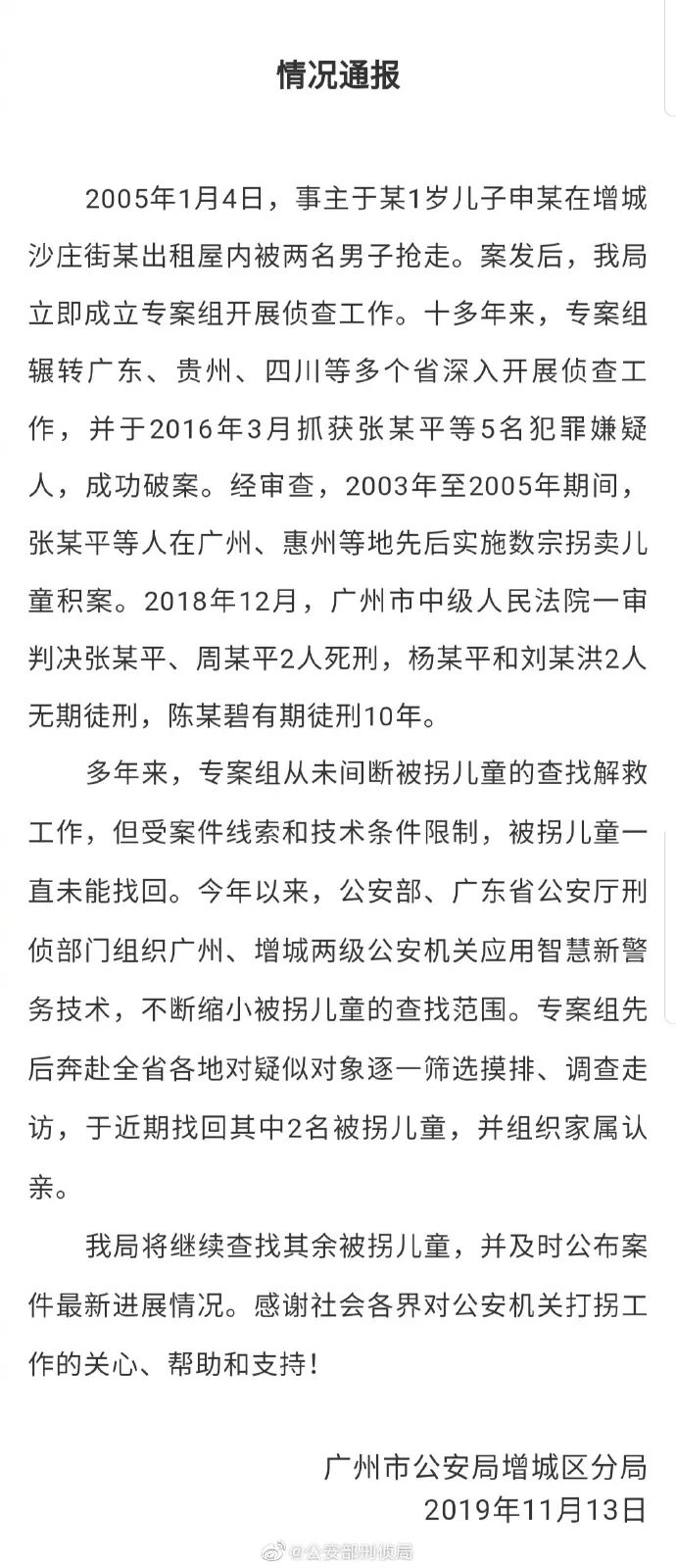 2005年1月4日,事主于某1岁儿子申某在增城沙庄街某出租屋内被两名男子抢走。案发后,我局立即成立专案组开展侦查工作。十多年来,专案组辗转广东、贵州、四川等多个省深入开展侦查工作,并于2016年3月抓获张某平等5名犯罪嫌疑人,成功破案。