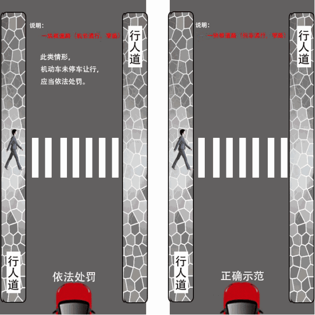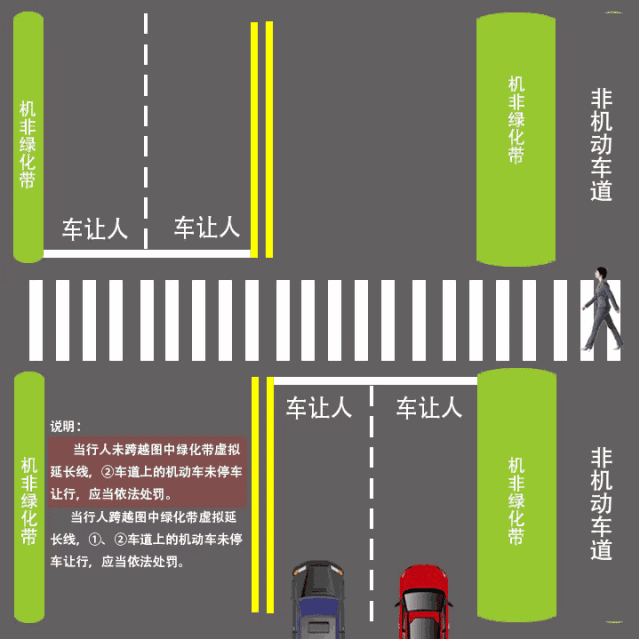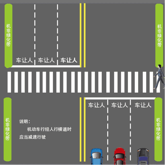 遇行人步入斑马线时,第③车道车辆必须让行,行人开始通过斑马线,所在车道车辆和下一车道车辆必须让行,行人到达中央绿化隔离带或双黄线,下一车道车辆必须让行。