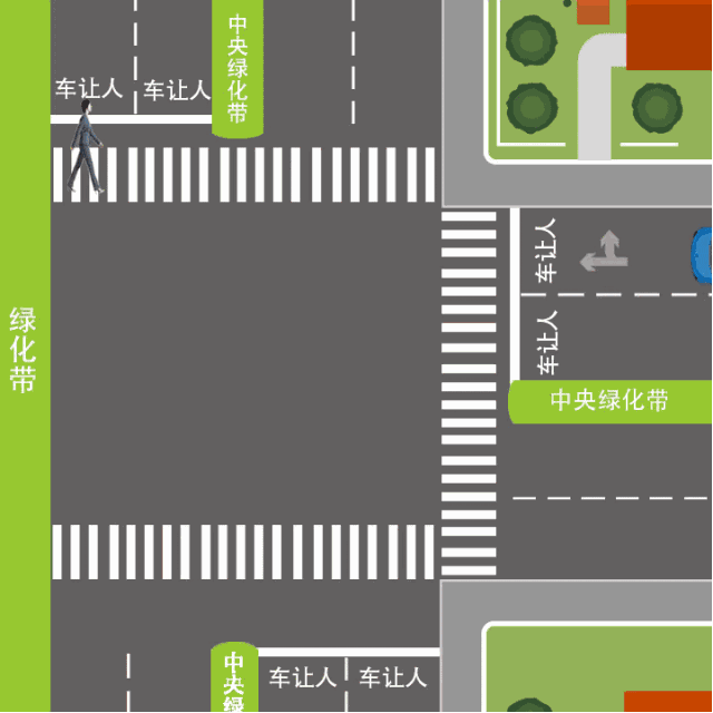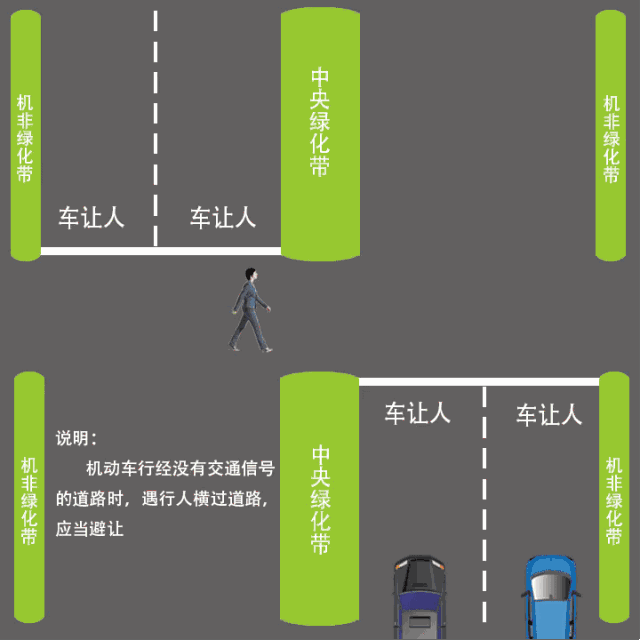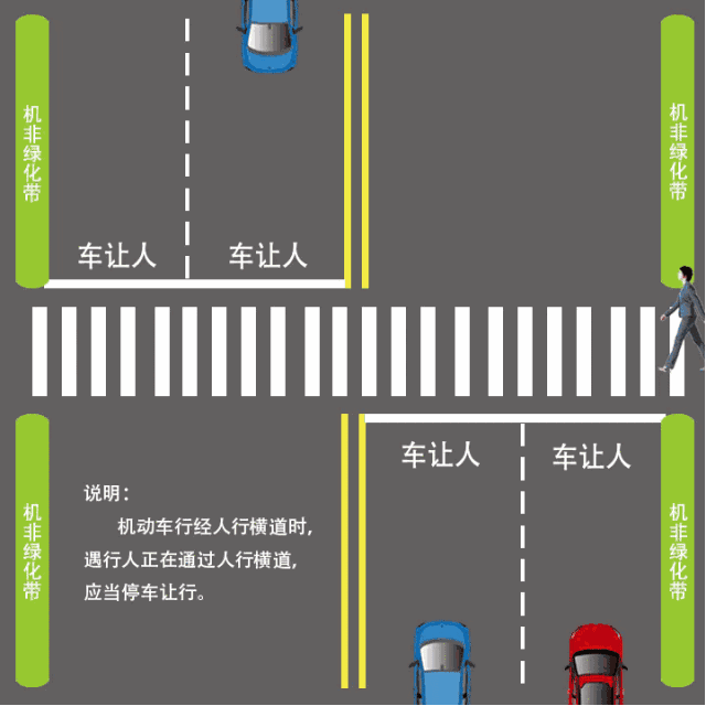 道路中央有双黄线或隔离栏,无绿化隔离带,行人步入斑马线,车辆必须让行。