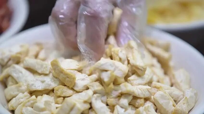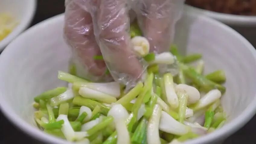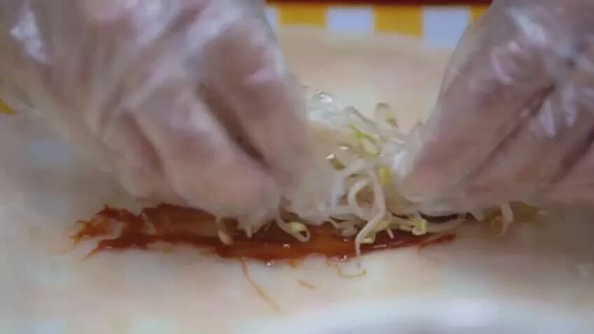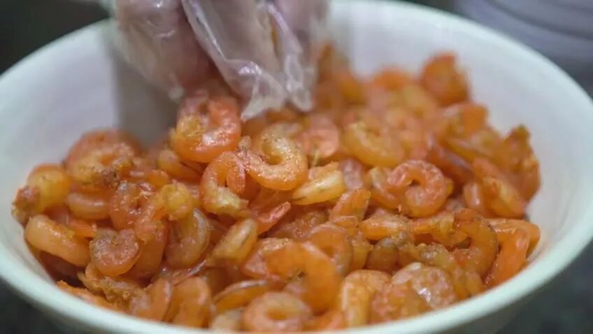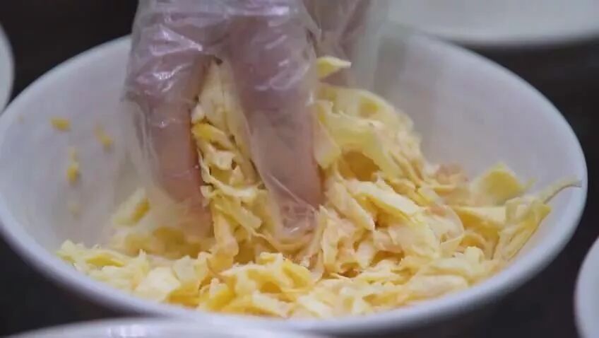 然后,将鲜虾仁、猪肉丝、鸡蛋、豆腐干、绿豆芽、葱头、菜脯丝,分别炒好、煎熟作馅用。