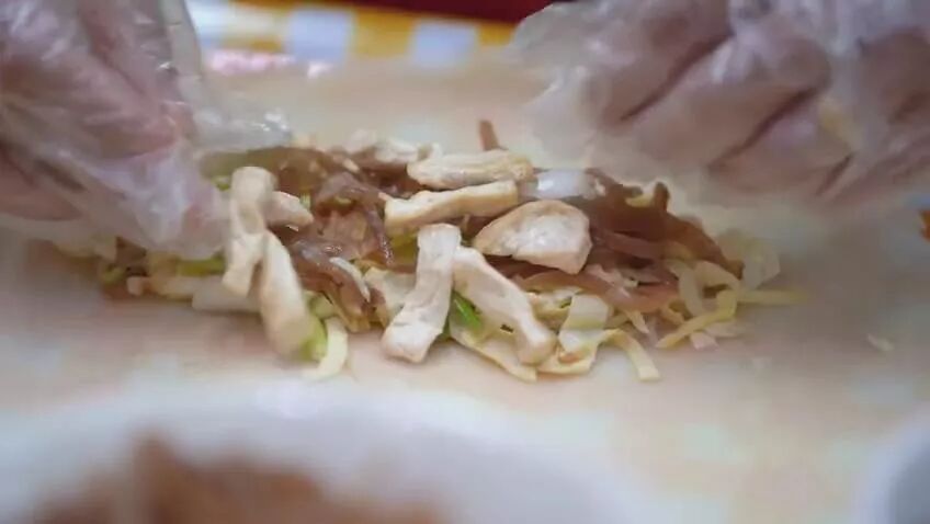 吃时将薄饼皮摊开,并将各种馅料适量放在薄饼皮内,再撒少许白沙糖,一起包在里面,卷成一筒状,吃起来风味独特,十分可口。