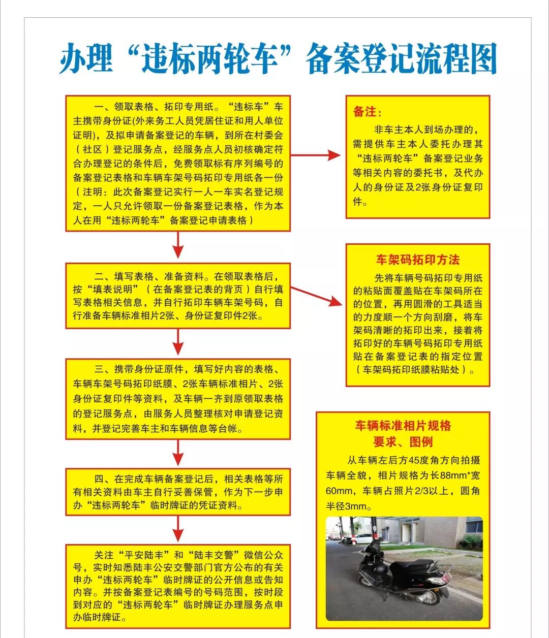 答:“违标车”临时牌照核发将在2020年1月1日至3月30日期间开展。请关注“平安陆丰”和“陆丰交警”微信公众号,及时获取官方公布的有关申办“违标两轮车”信息,按备案登记表编号的号码范围,并按时段到对应的“违标两轮车”临时牌证办理服务点申办临时牌证。