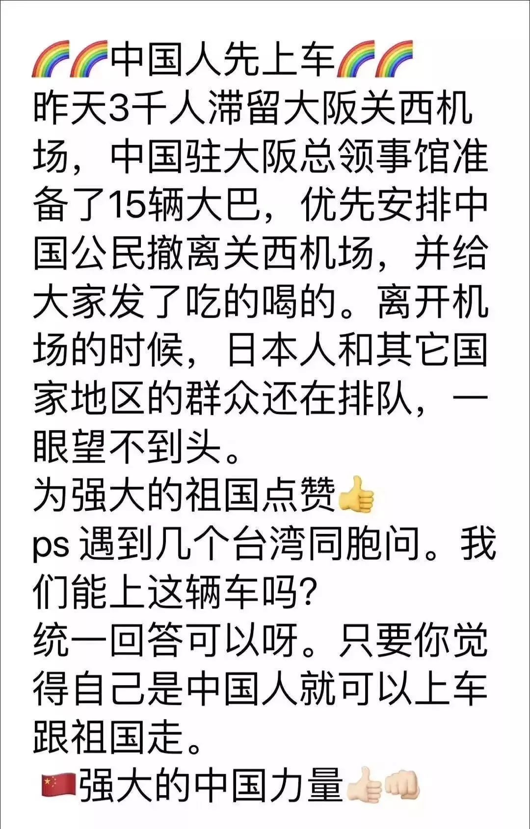 这其中值得一说的,就是去年闹得沸沸扬扬的台胞从日本关西机场撤离一事。2018年9月,受到台风“飞燕”影响,日本大阪关西机场一度关闭,众多中国游客滞留机场。之后,我驻当地领事馆及时安排车辆,分六批将中国旅客撤出机场,其中就包括32位台湾同胞。