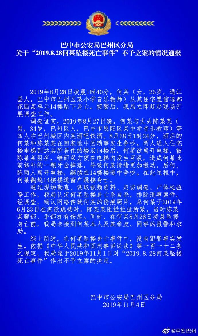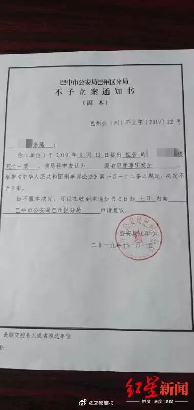 据何某父亲透露,对于女儿坠亡一案,四川巴中市公安局巴州区分局11月1日发出不予立案通知书。