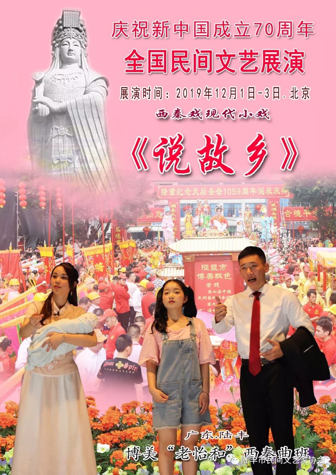 据悉,为了热烈庆祝新中国成立70周年,由中国民间文艺家协会主办,中国文联民间文艺艺术中心、中国民协民间戏曲艺术委员会承办的“全国民间文艺(说唱、小戏、小品、音舞)作品征集、展演”活动在北京举办。经组委会评选,由陆丰市委宣传部报送,广东省民协推荐的陆丰市博美西秦曲班作品西秦现代小戏《说故乡》入选。按文件通知要求,西秦现代小戏《说故乡》将于12月1日至3日在北京展演。