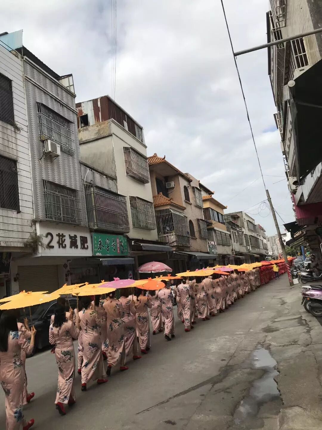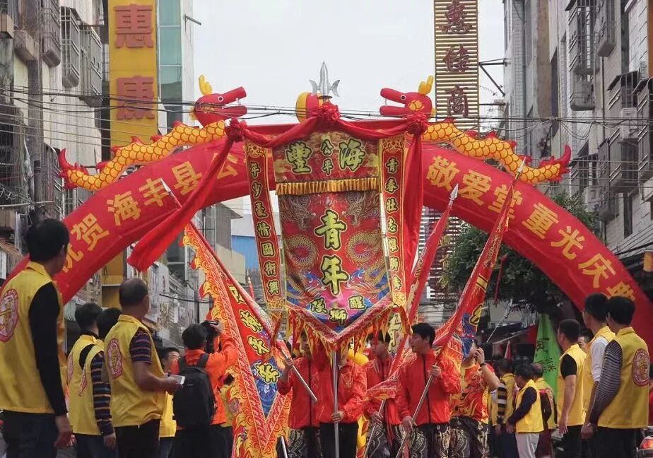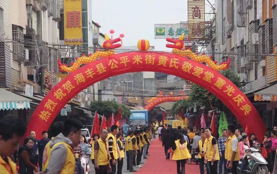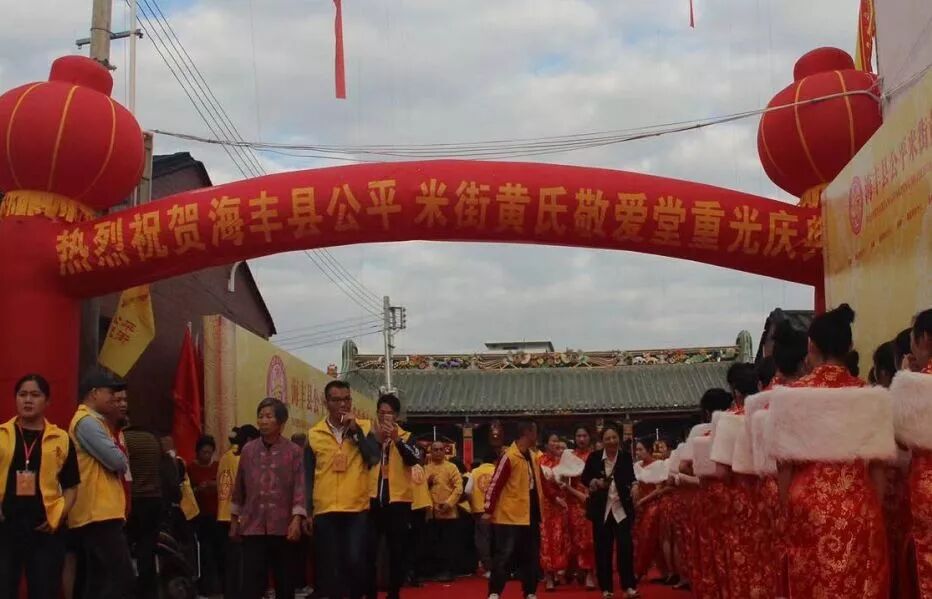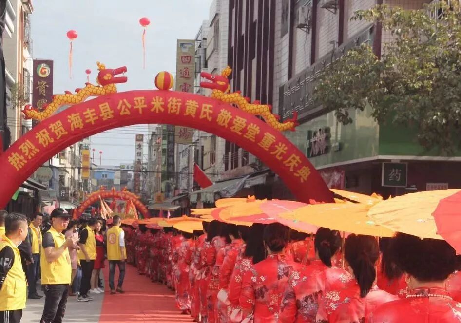 12月18日,海丰公平米街黄氏敬爱堂鞭炮齐鸣,醒狮起舞,数百名外嫁女身着旗袍,撑着油纸伞,盛装打扮回到娘家。她们排着整齐的队伍,在醒狮的引领下回娘家,参加公平米街黄氏敬爱堂重光庆典活动,更是受到娘家叔伯兄弟的热烈欢迎和热情接待,场面火爆,热闹非凡。