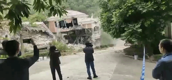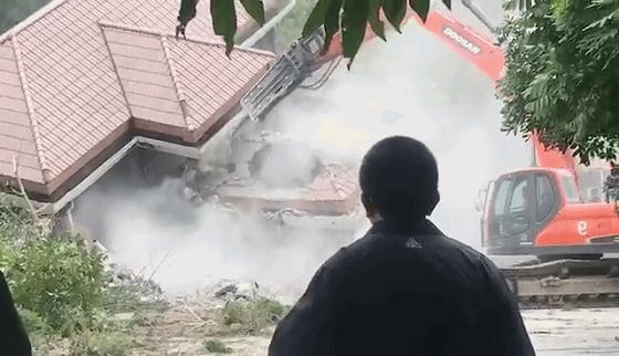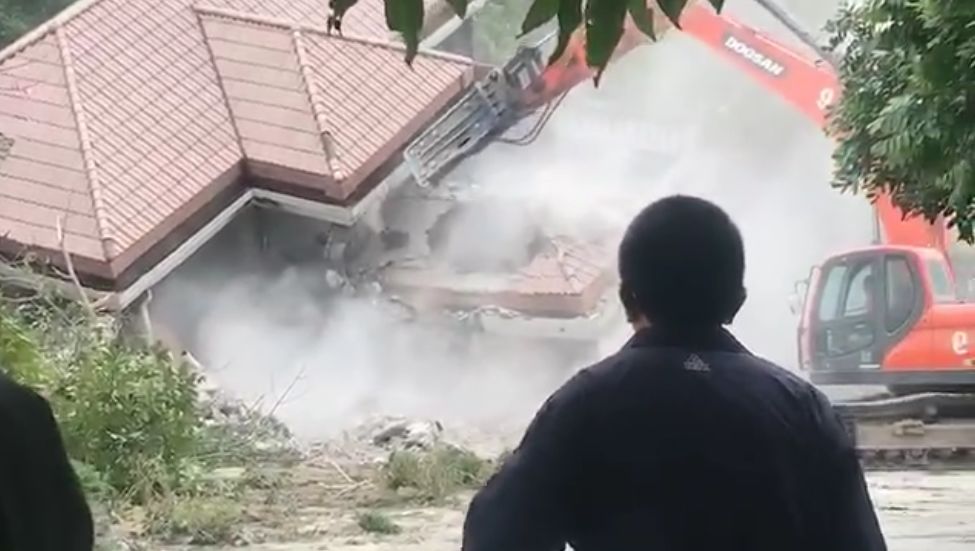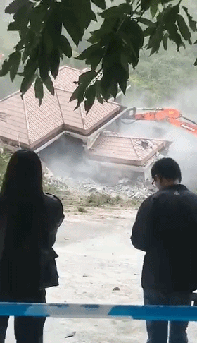 今天收到网友报料,称砲台风门古径附近违建别墅被强制拆除。从视频可见,现场拉起警戒线,执法组已到场指导,出动大型器械拆除,一栋违建楼房轰然倒下。