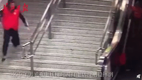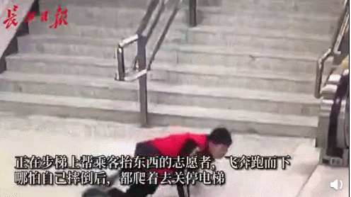 11月24日,湖北武汉地铁7号线的电扶梯上,一位乘客摔倒了,眼看乘客可能要遇到危险。这时,一道红色的身影飞奔而来。由于速度过快,这位身着红衣的志愿者一个没站稳也摔倒了。
