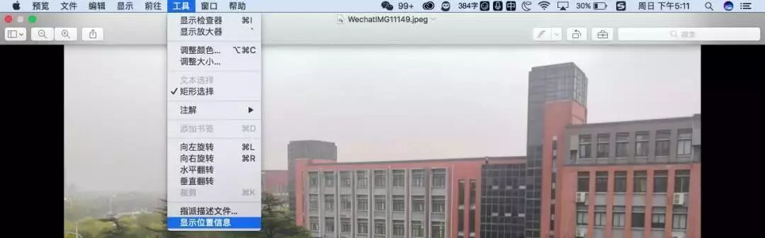 将微信好友发来的原图下载保存到电脑,打开图片,点击“显示位置信息”。
