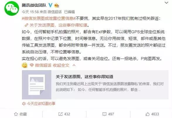 但腾讯微信团队同时指出,如今任何智能手机拍摄的照片,都含有Exif参数,可以调用GPS全球定位系统数据,在照片中记录下位置、时间等信息。无论你用微信、短信、邮件或是其他传输工具发送原图,都会将附带信息一并发送。微信表示,朋友圈发送的照片都经过系统自动压缩,不带位置等信息,因此,所谓的地理位置信息泄露,与微信无关。