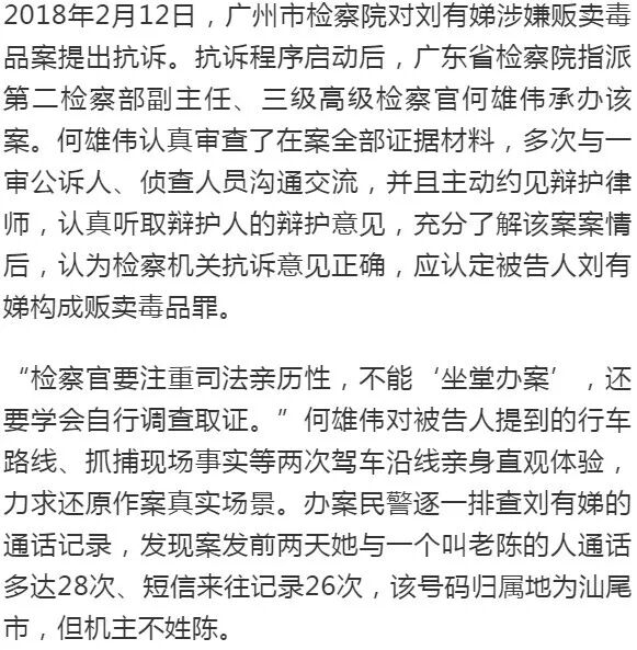 庭审中,何雄伟对全案证据进行深入梳理,举证时精心制作庭审示证PPT和刘有娣案贩毒证据人物关系图、刘有娣活动轨迹图、刘有娣贩毒案证据导图,有理有据地论述了检察机关的抗诉意见,全面有力地反驳了无罪辩解意见,取得了良好的庭审效果。