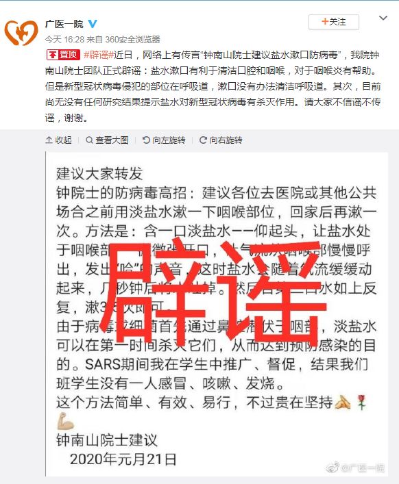 关于网上传言“钟南山院士建议盐水漱口防病毒”,广医一院院钟南山院士团队正式辟谣:盐水漱口有利于清洁口腔和咽喉,对于咽喉炎有帮助。但是新型冠状病毒侵犯的部位在呼吸道,漱口没有办法清洁呼吸道。其次,目前尚无没有任何研究结果提示盐水对新型冠状病毒有杀灭作用。请大家不信谣不传谣,谢谢。