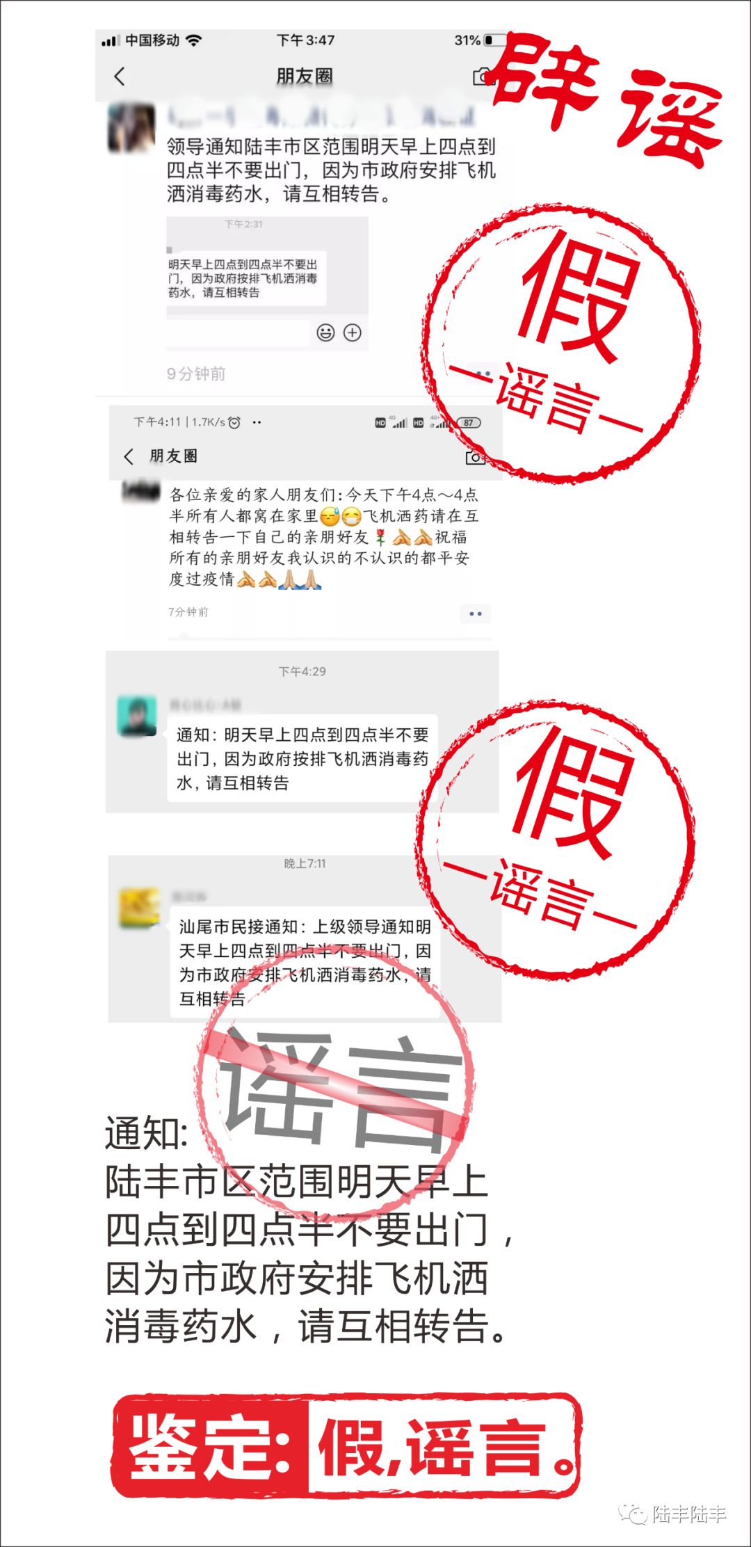 近日,汕尾市、陆丰市朋友圈传播着这样的谣言!经网警查证,全国各地都有这类谣言的存在。请海陆丰市民擦亮眼睛,不传谣,不信谣!坚决对散布谣言者说不!