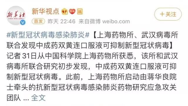 1月31日,新华社从中国科学院上海药物所获悉,该所和武汉病毒所联合研究初步发现,中成药双黄连口服液可抑制新型冠状病毒。![]()
