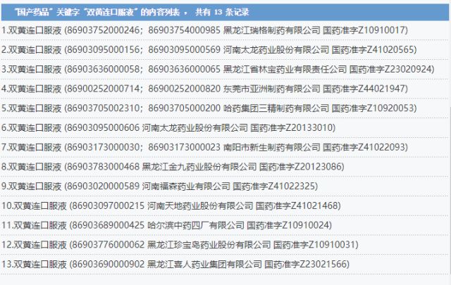国家药品监督管理局官网显示,涉及双黄连口服液,有河南太龙药业、哈药集团三精制药、河南福森药业、黑龙江珍宝岛等12家药企13个生产批号。上市企业中,河南太龙药业在2019年半年报表示,双黄连口服液系列产品为公司传统优势品种,包含普通型、浓缩型、儿童型等多种品规,且浓缩型和儿童型双黄连口服液、双金连合剂为公司独家产品,市场占有率在同类产品中处于领先地位。哈药股份在2019年新版医保目录中,公司的双黄连口服液从医保乙类升为甲类。福森药业2018年在港股上市,双黄连类感冒药是其核心产品。![]()