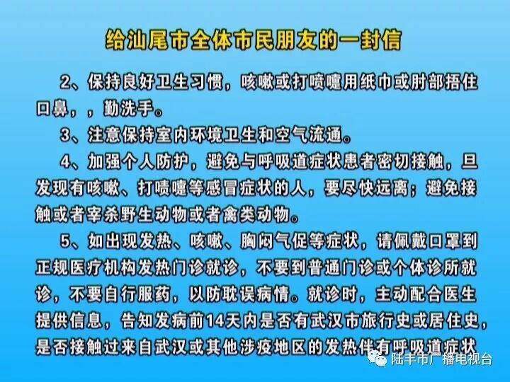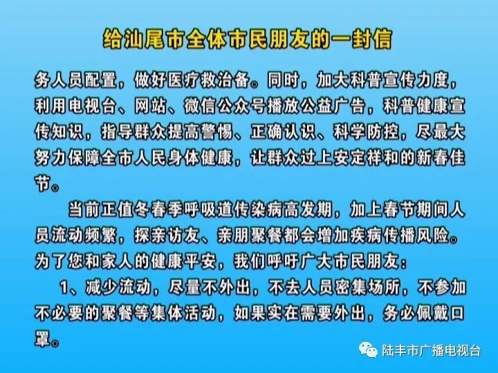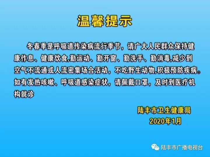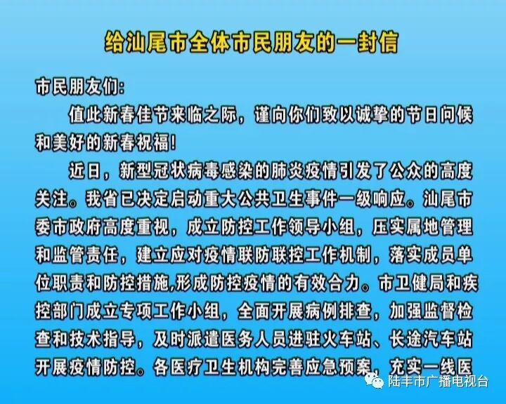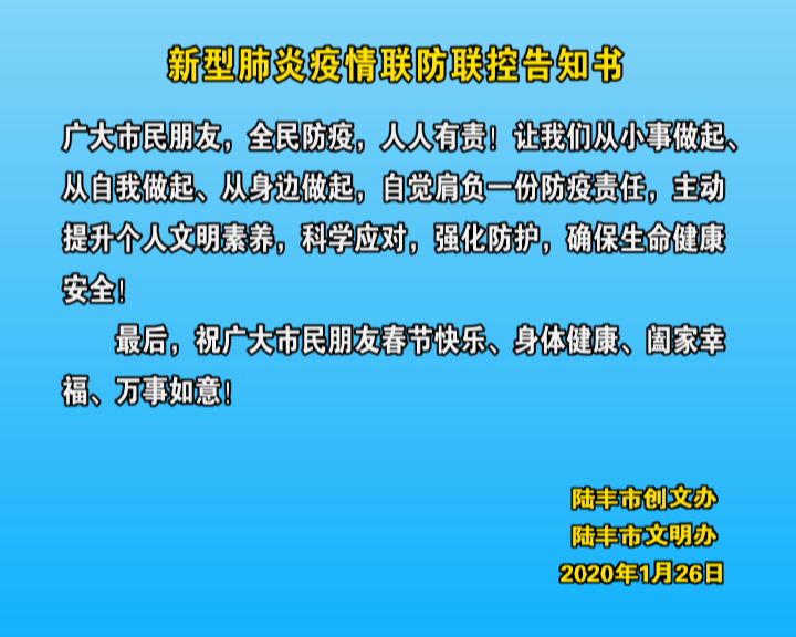 新年好!近期,湖北武汉发生的新型冠状病毒感染的肺炎疫情已在全国蔓延,形势十分严峻。广东省已于1月23日启动突发公共卫生事件一级应急响应。陆丰市委、市政府坚决贯彻落实习近平总书记重要指示和李克强总理批示精神,按照党中央和省委、汕尾市委决策部署,成立了由市委、市政府主要领导挂帅的疫情防控总指挥部,统筹组织各方力量资源,周密部署、精心安排,全力以赴开展疫情防控和救治工作,各项工作有力有序进行。