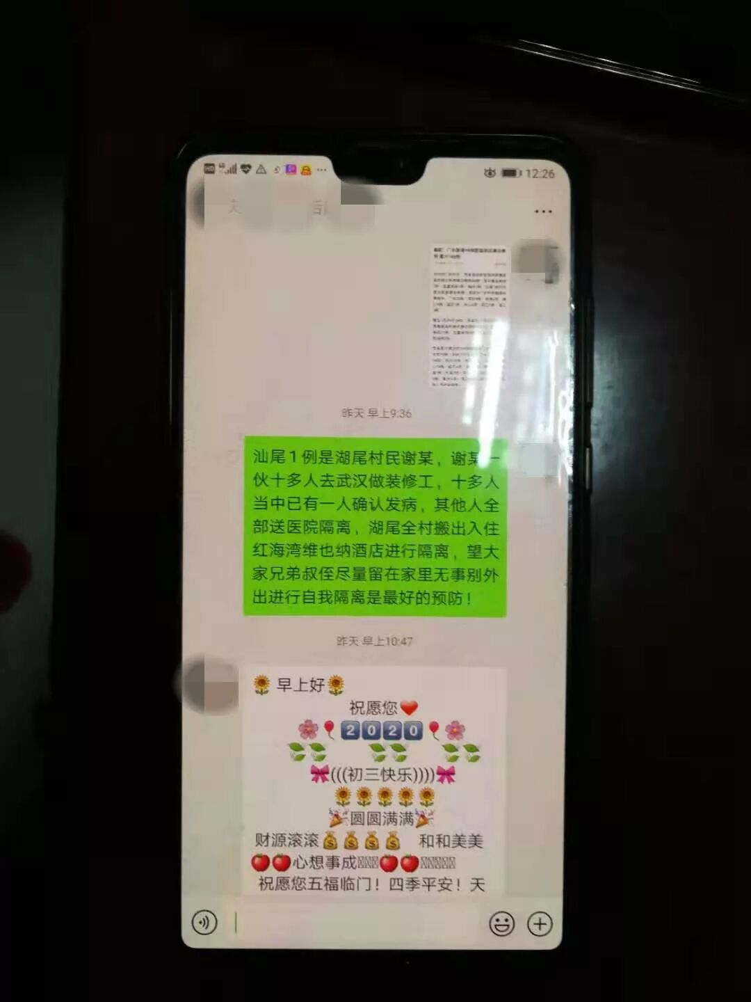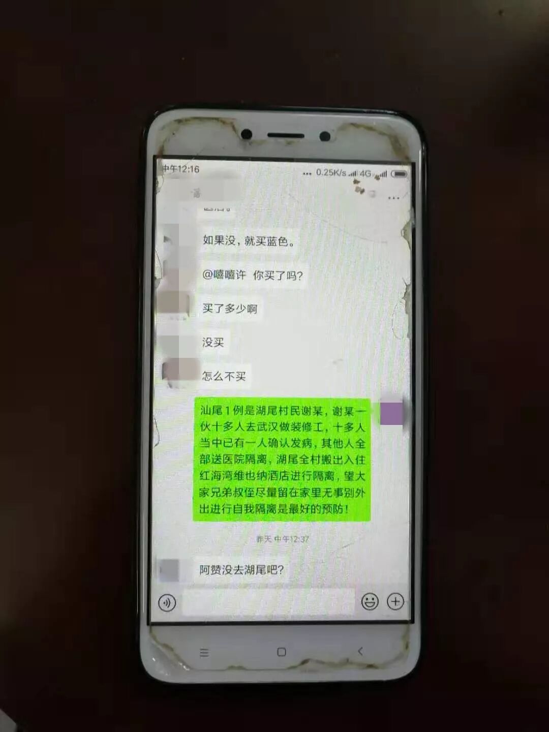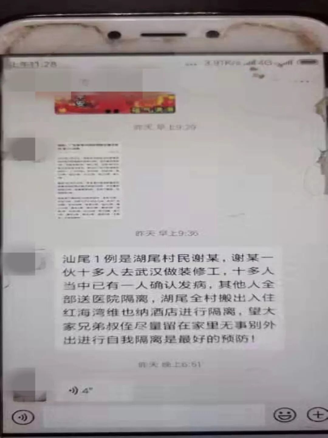 1月28日,红海湾公安分局民警在网上巡查中发现,有网民在微信群中发布“汕尾首例确诊新型冠状病毒肺炎患者是湖尾村村民谢某,湖尾村全村村民已被隔离”的信息,又被他人转发至多个微信群。