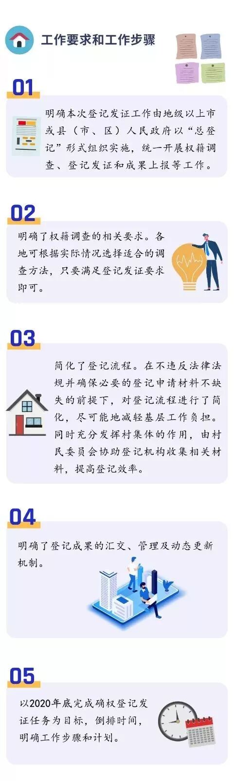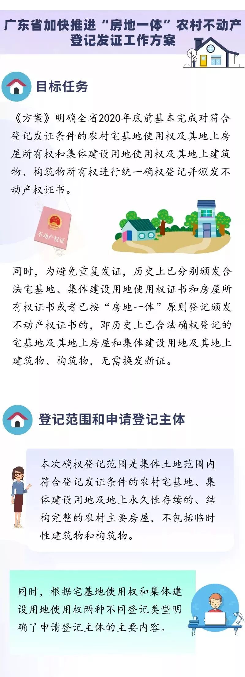 《方案》在目标任务中提出, 以“总登记”方式对符合登记发证条件的宅基地使用权及其地上房屋所有权和集体建设用地使用权及其地上建筑物、构筑物所有权进行统一确权登记并颁发不动产权证书,确保2020年底前基本完成全省“房地一体”农村不动产登记发证工作。