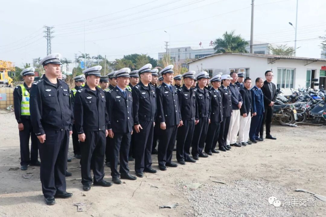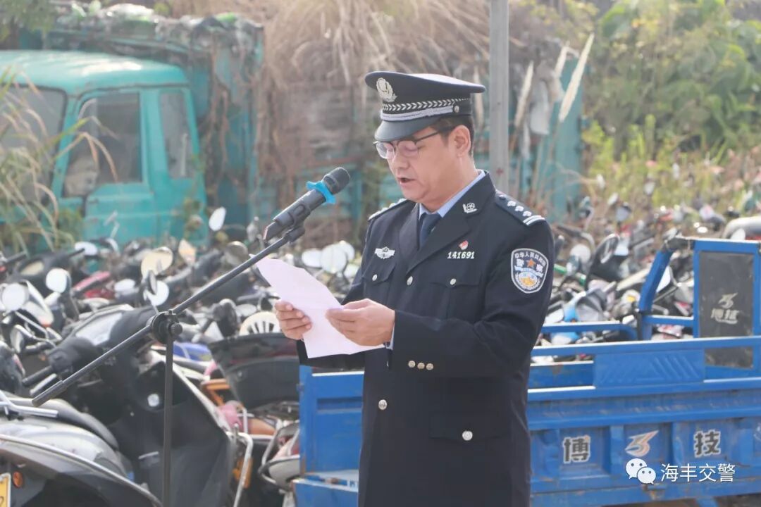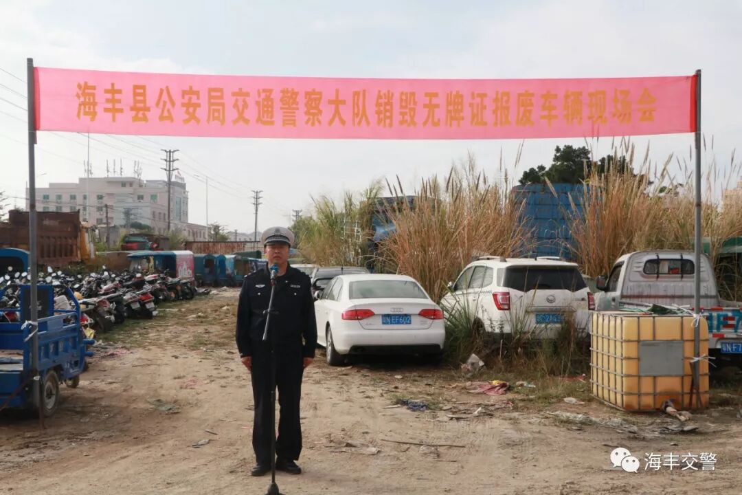 为进一步扎实做好今年春运交通安全管理工作,加强各级停车场清理,更好地解决查扣违法车辆的停放问题,震慑各类交通违法行为, 2020年1月6日上午,海丰县公安局在交警大队停车场召开销毁无牌无证、报废车辆现场会。