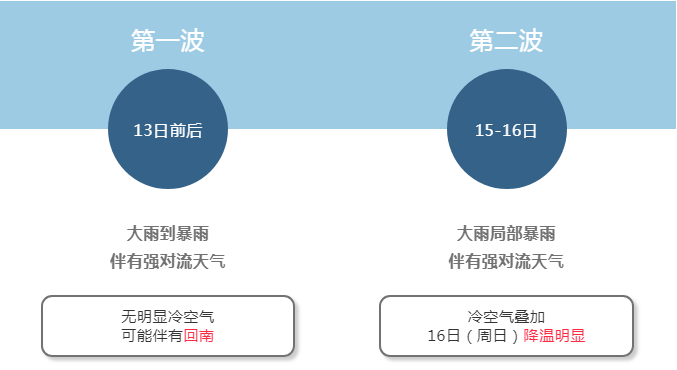 总的来说,11-16日雨水频繁,有两波明显降雨过程。第一波:13日前后,有大雨到暴雨局部大暴雨;15-16日,冷空气叠加影响,除了降雨,还会降温。