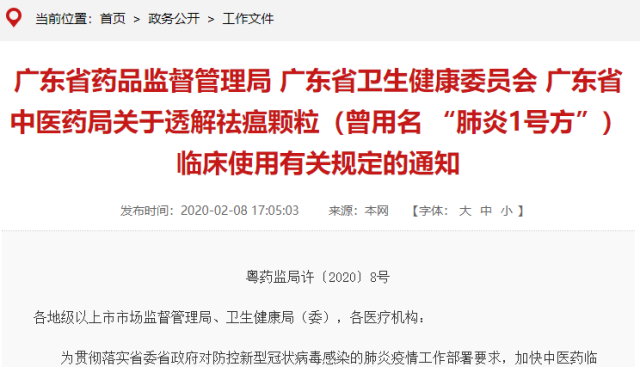 好消息!“肺炎1号方” 透解祛瘟颗粒 获批用于广东30家定点救治医院