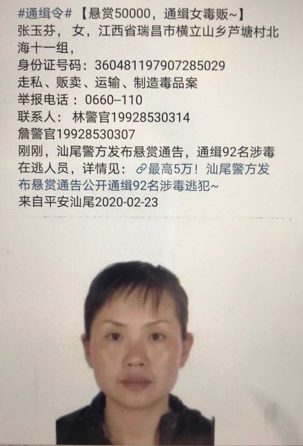 (2月22日,汕尾警方悬赏通缉92名涉毒逃犯,张玉芬是其中之一)