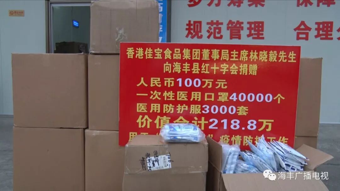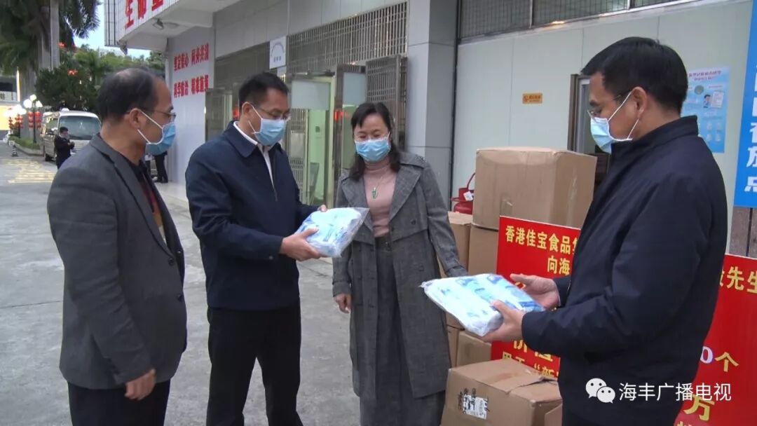 2月16日,海丰籍香港佳宝食品集团董事局主席林晓毅向海丰县捐赠人民币100万元和一次性医用口罩40000个、医用防护服3000套等疫情应急防控物资,总价值218.8万元,助力海丰疫情防控。