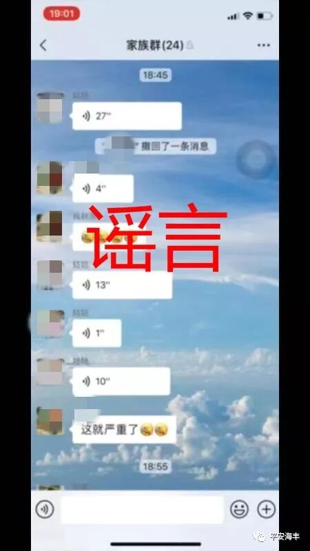 1月30日,海丰县一网民在微信家族群聊天称“梅陇有新增病例,且有一女子从湖北回家请客,现需要隔离”的群聊语音视频,造成严重的社会影响。经公安机关核实,属谣言。近日,发布谣言的当事人到派出所自首,公安机关对其作出批评教育,并要求其向广大市民公开道歉。为应对当前新型冠状病毒感染的肺炎疫情,全县各部门始终把人民群众生命安全和身体健康放在第一位,进一步压紧压实责任,严之又严、实之又实、细之又细地做好各项工作,全力以赴抓好开展防控工作。至发稿止,海丰县尚没有发现新型冠状病毒感染的肺炎疑似病例和确诊病例,请广大网民自觉抵制谣言,做到不造谣、不传谣、不信谣,做守法公民。![]()