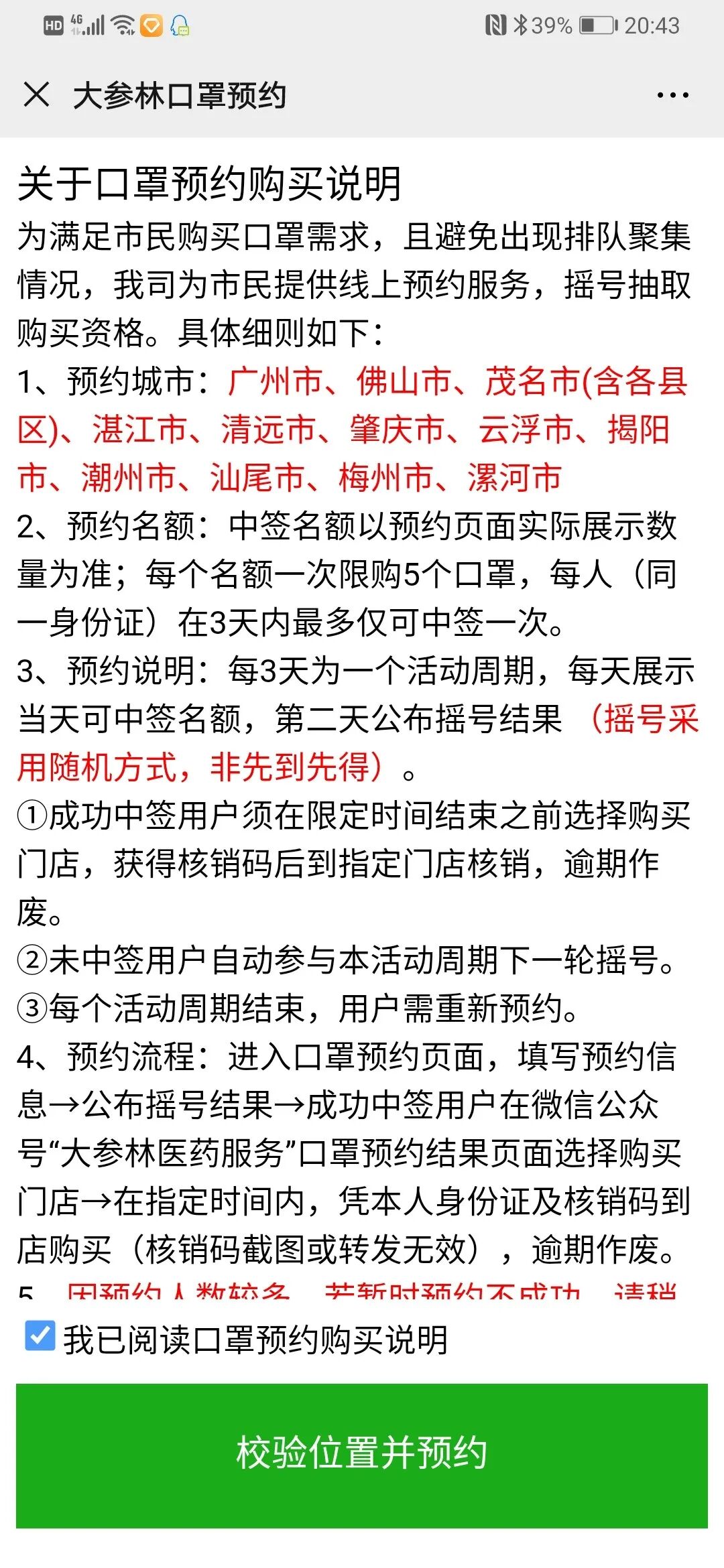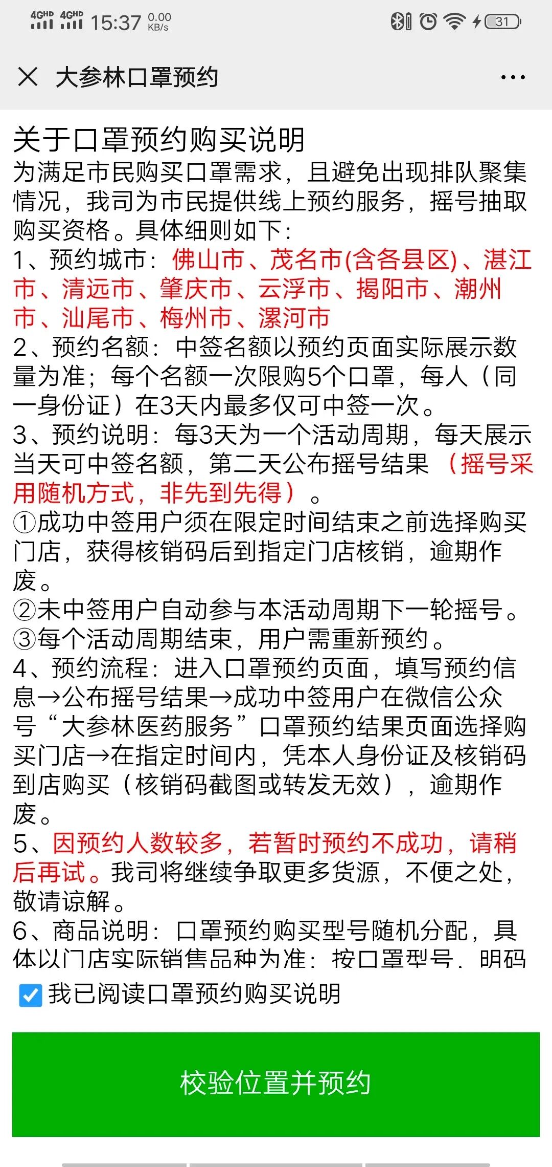 ②阅读并勾选口罩购买说明,然后点击填写预约信息;