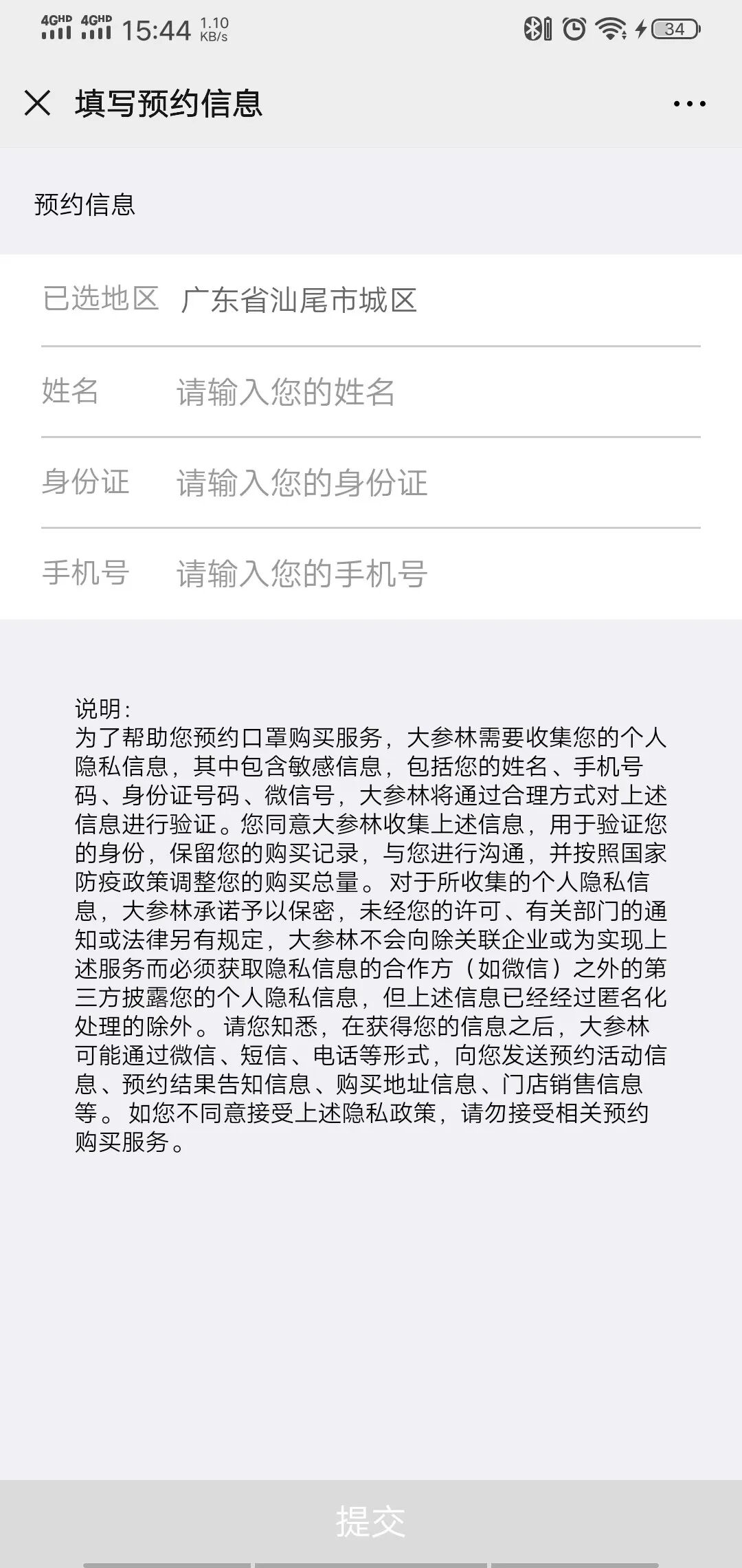 ④选择区域后,填写预约信息;