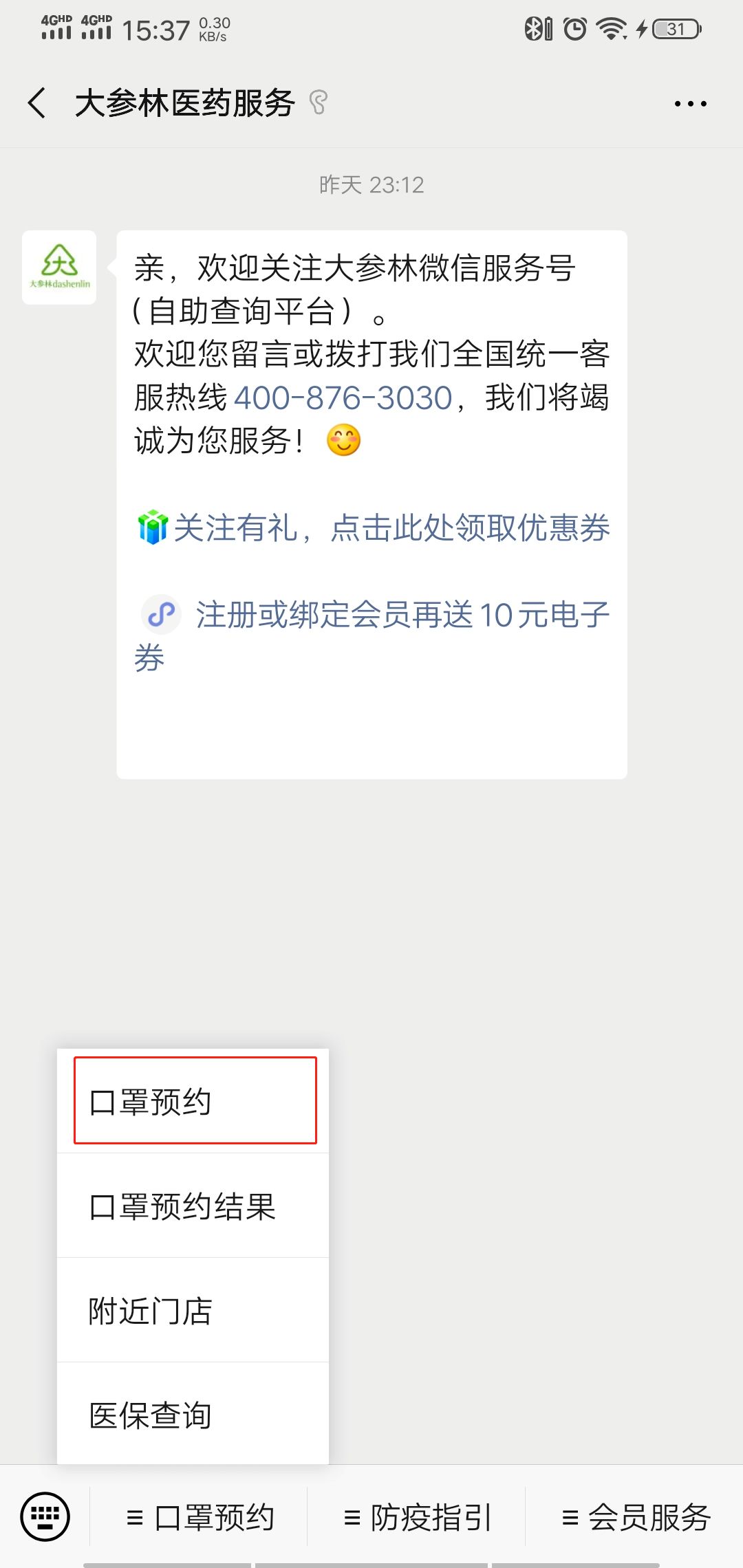 ①关注大参林医药服务号,点击菜单【口罩预约】;