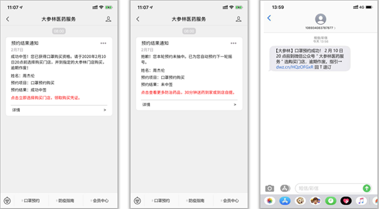 获得公众号预约结果通知(前提是有关注大参林医药服务号);获得短信通知。