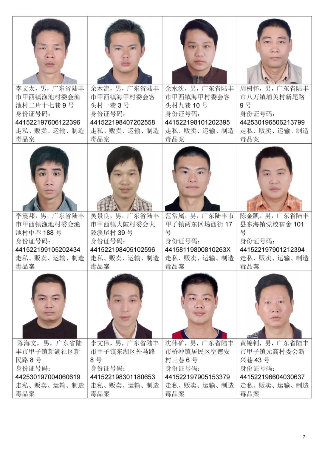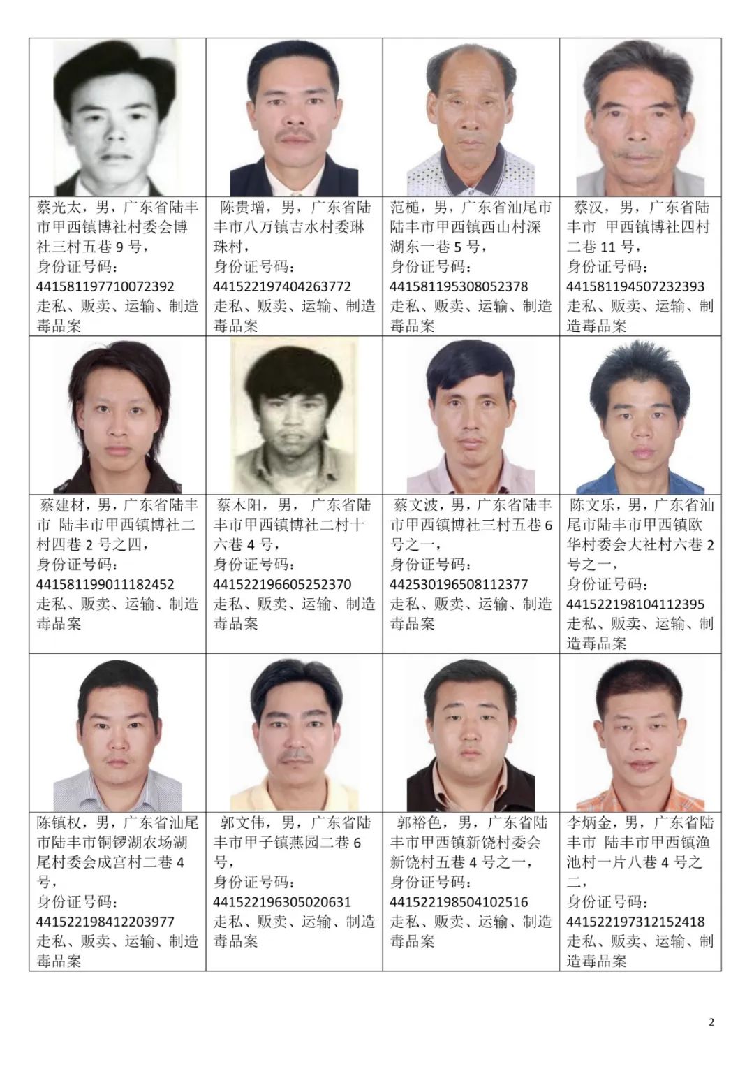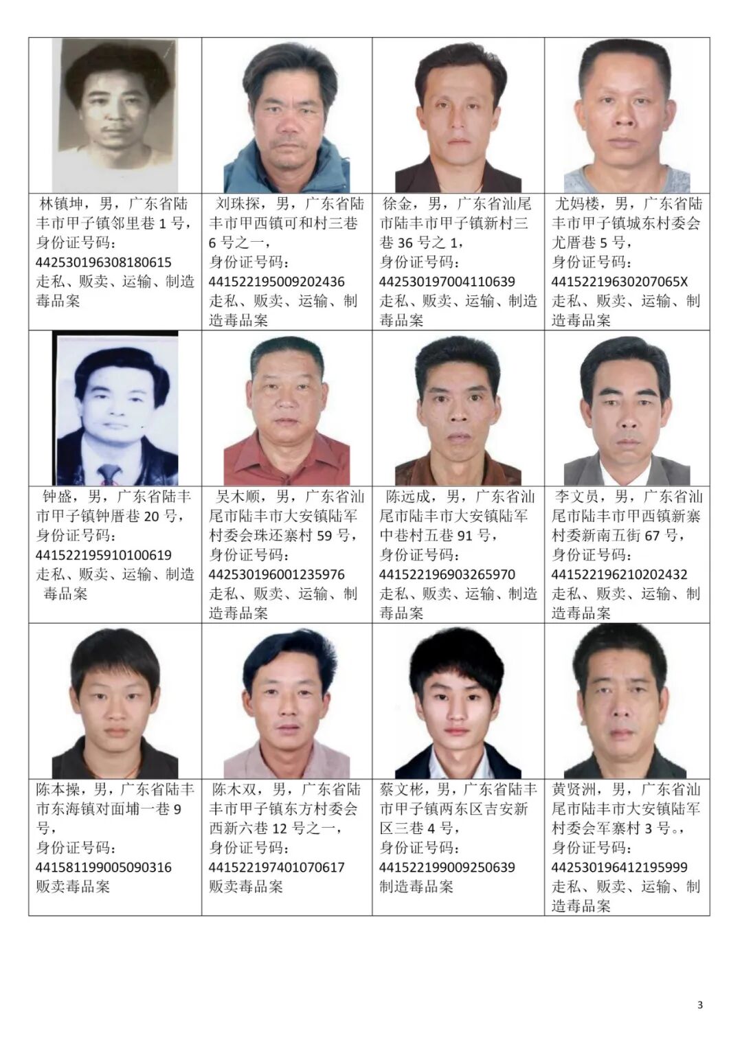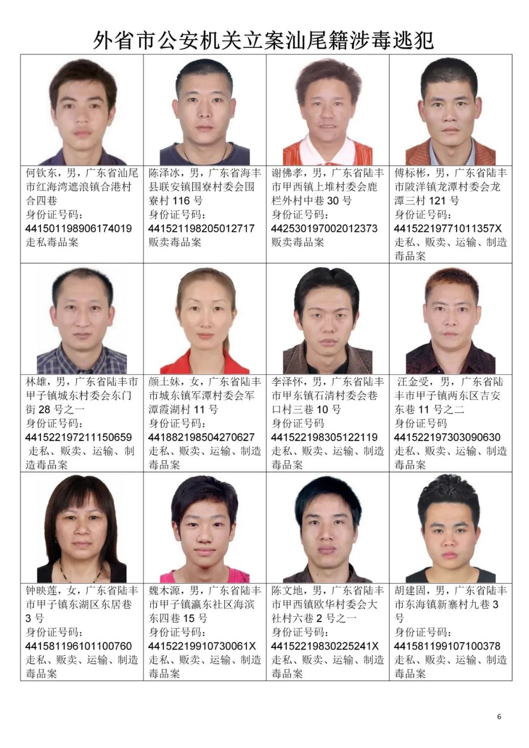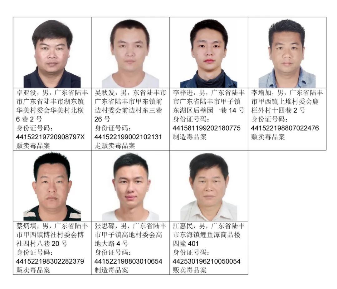 为严厉打击毒品犯罪活动,汕尾市公安局决定对92名涉毒逃犯进行公开悬赏通缉,希望社会各界和广大人民群众积极检举揭发和提供线索,公安机关将对举报人的个人信息严格保密。对提供准确线索,经公安机关核实并抓获相关人员的,汕尾市公安局将在各县区原有的悬赏基础上,追加悬赏奖励:每抓获一名我市公安机关立案的涉毒逃犯,奖励举报人人民币5万元;每抓获一名外省、市公安机关立案的汕尾籍涉毒逃犯,奖励举报人人民币3万元。