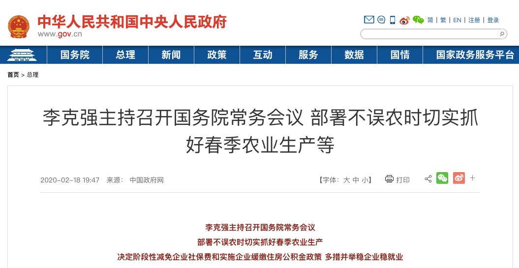 国务院总理李克强2月18日主持召开国务院常务会议,部署不误农时切实抓好春季农业生产;决定阶段性减免企业社保费和实施企业缓缴住房公积金政策,多措并举稳企业稳就业。