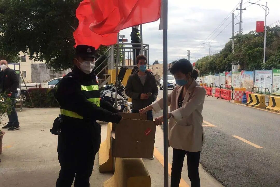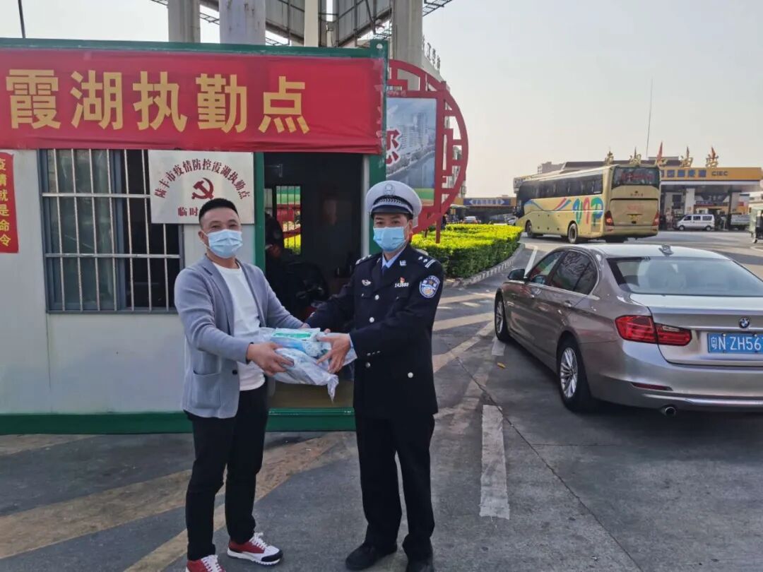 爱心人士林先生前来霞湖执勤点赠送口罩。