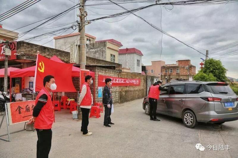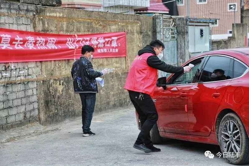 城东镇淡水村党员干部在主要路口设置检查卡点,登记过往车辆,为过路群众测量体温,构筑抗击疫情的安全防线。