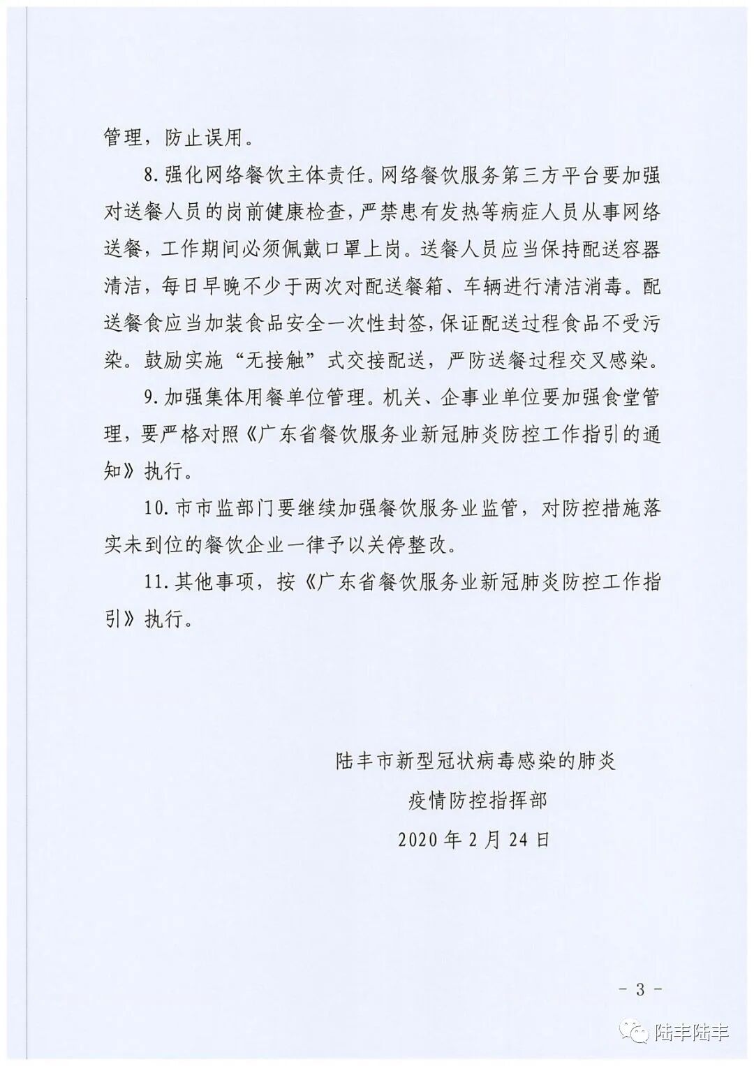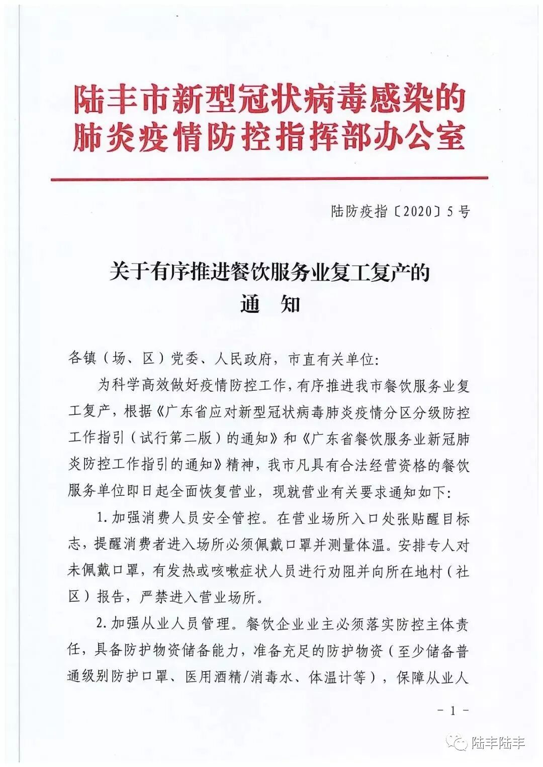 2月24日,陆丰市疫情防控指挥部办公室印发通知,为有序推进我市餐饮服务业复工复产,决定从即日起凡具有合法经营资格的餐饮服务单位全面恢复营业。通知如下: