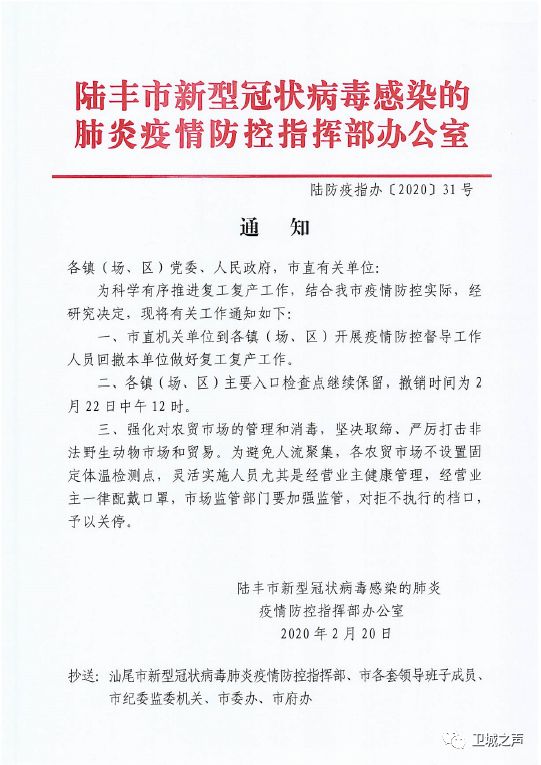 2月20日,陆丰市疫情防控指挥部办公室印发通知,决定从2月22日中午12时起撤销各镇(场、区)主要入口检查点;农贸市场不设置固定体温检测点,经营业主一律佩戴口罩,对拒不执行的档口,予以关停。通知如下: