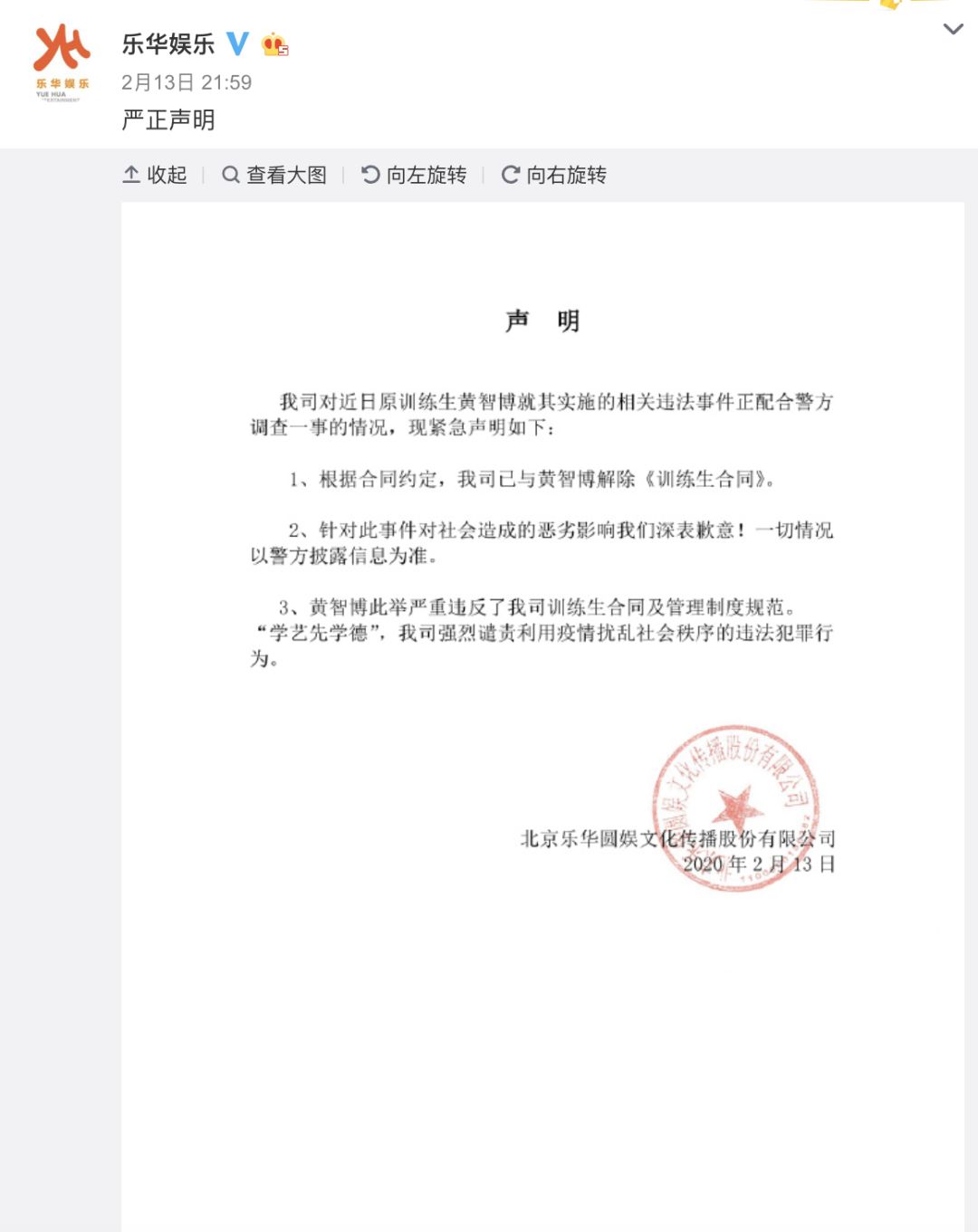 13日晚,针对练习生黄智博“借卖口罩实施诈骗被抓”一事,乐华娱乐在新浪微博发表声明,表示黄智博此举严重违反了公司训练生合同及管理制度规范,公司已与黄智博解除《训练生合同》。乐华娱乐强烈谴责利用疫情扰乱社会秩序的违法犯罪行为,并针对此事件对社会造成的恶劣影响深表歉意。