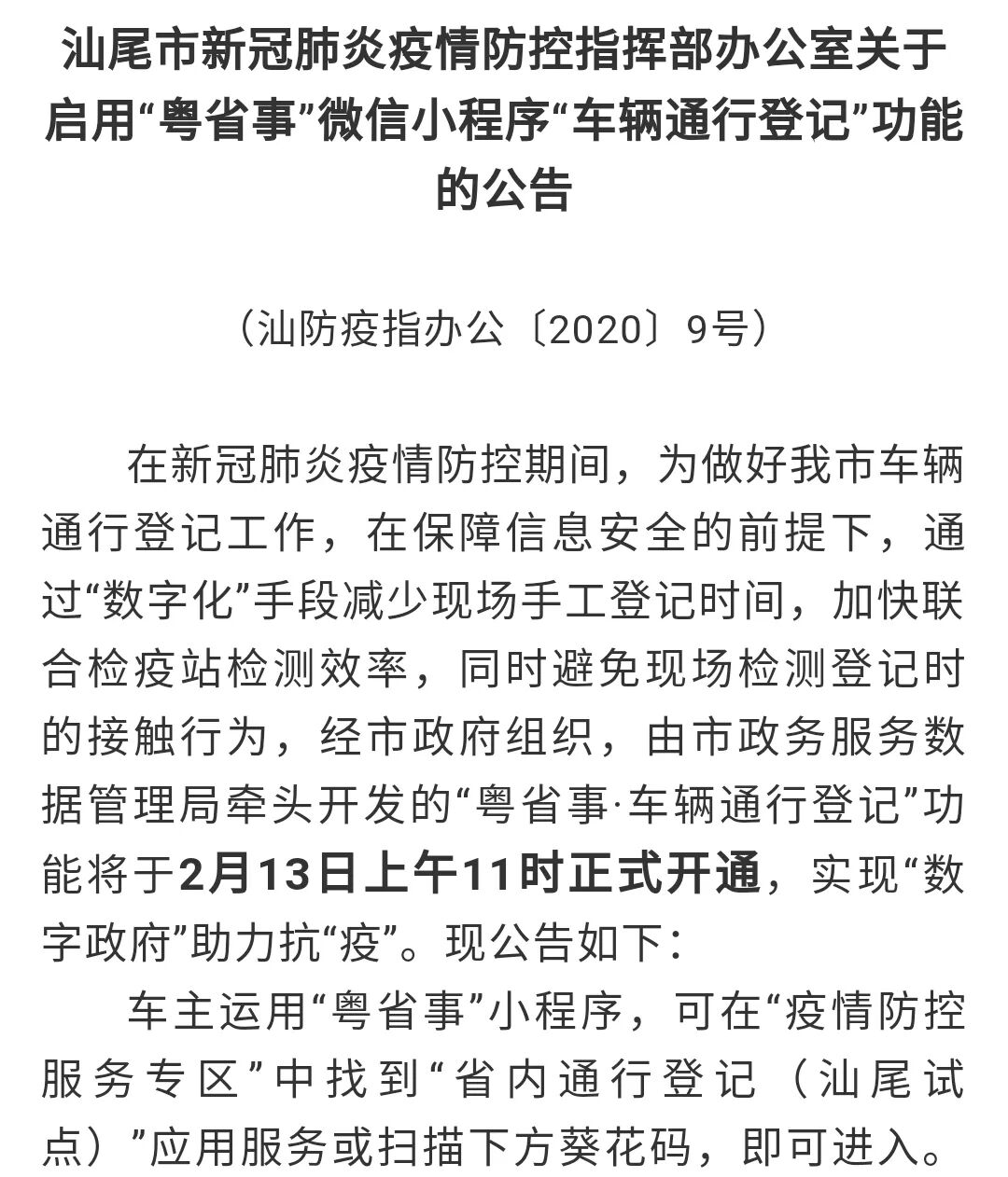 2月12日,汕尾市新冠肺炎疫情防控指挥部办公室发布公告,由汕尾市组织开发的“粤省事·车辆通行登记”功能于2月13日上午11时正式开通。