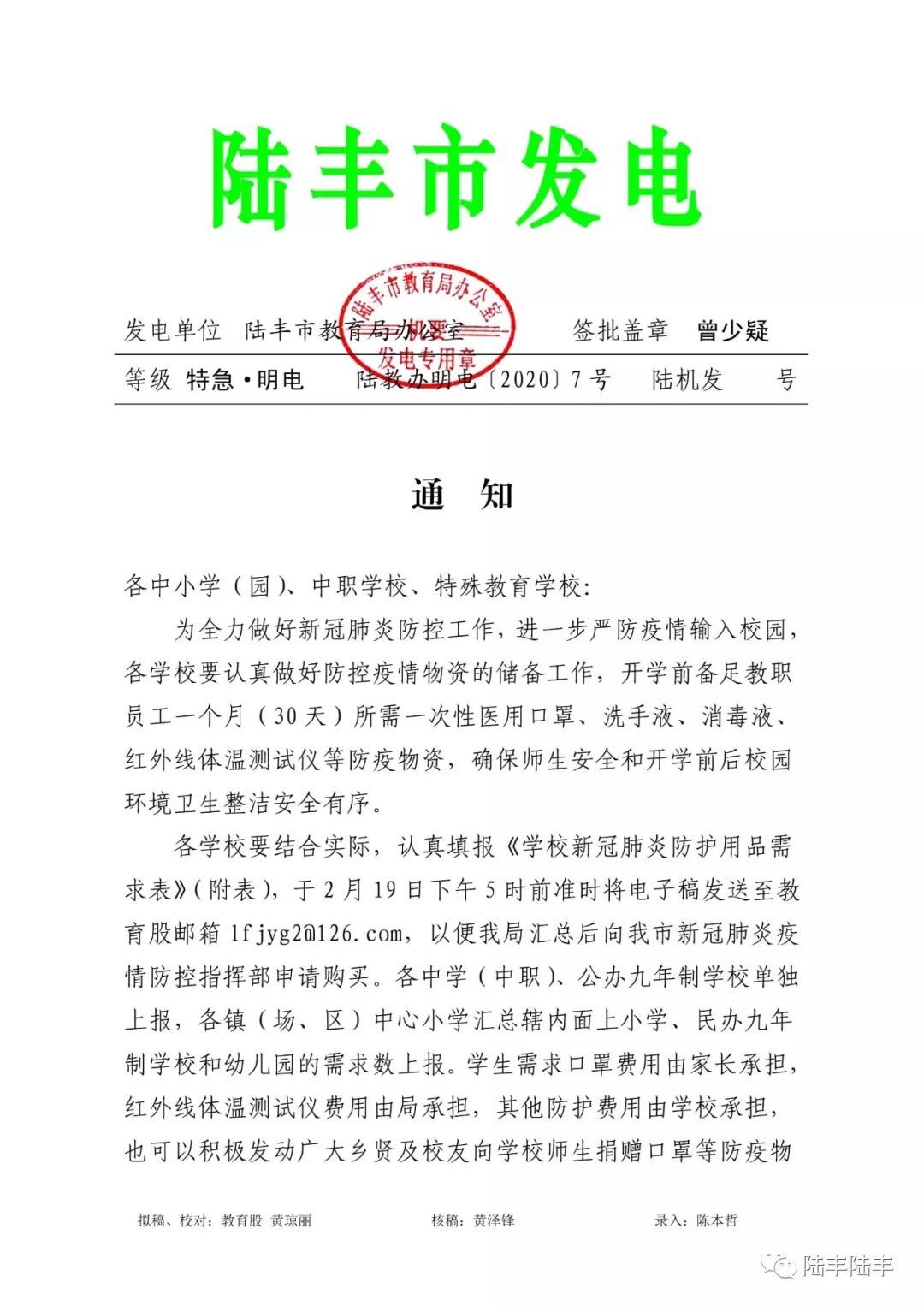 为全力做好新冠肺炎防控工作,进一步严防疫情输入校园,陆丰市教育局于日前发文,要求全市各学校认真做好防控疫情物资的储备工作。其中,教育局将为学生统一采购一次性医用口罩,学生需求口罩费用由家长承担。 据悉,这次统一订购以自愿为原则,如果学生自己已经有足够的口罩,可以不用再订购。另外,小编从陆丰一些学校学生家长群中的通知获悉,学生上学必须佩戴口罩。