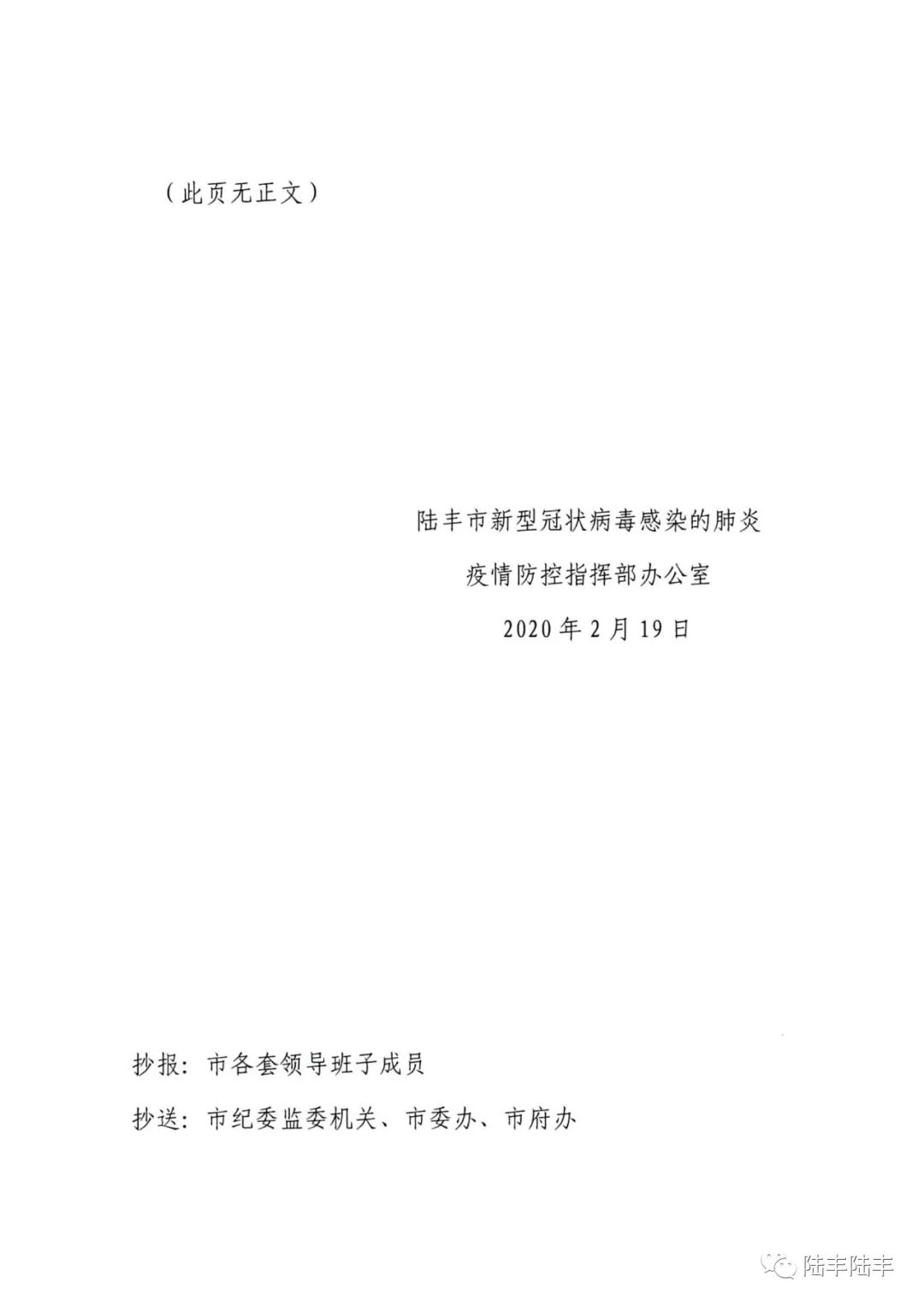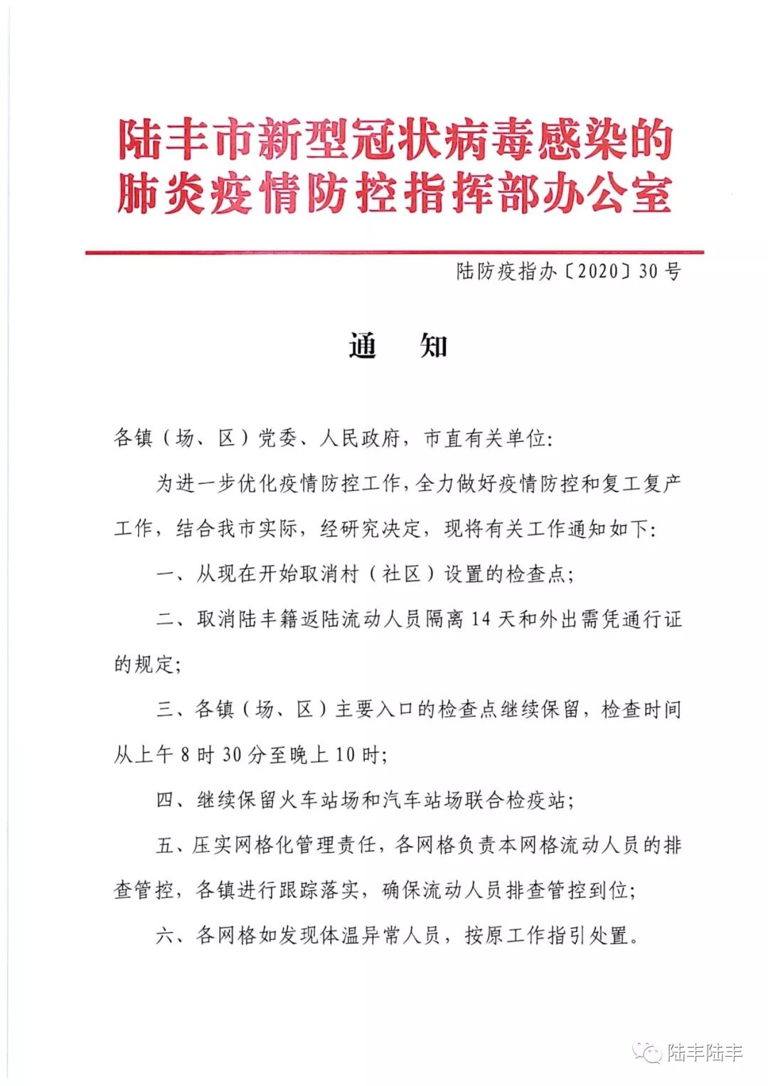 2月19日,陆丰市疫情防控指挥部办公室印发通知,决定从现在开始取消村(社区)设置的检查点,取消陆丰籍返陆流动人员隔离14天和外出需凭通行证的规定。通知如下: