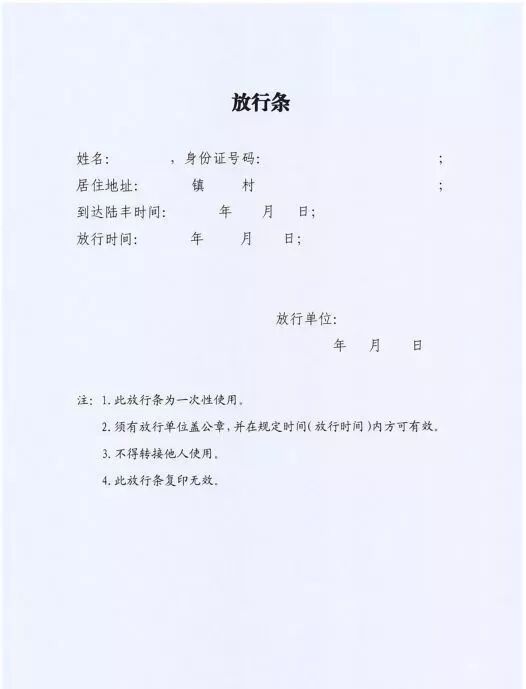 四、凡陆丰籍在外地人员回陆丰市的,应在到达陆丰市当天到村(社区)报告并进行健康检査,后居家隔离14天,如有特殊情况需要外出的,应向当地村(社区)报告,健康无异常的,由当地村(社区)开具放行条。