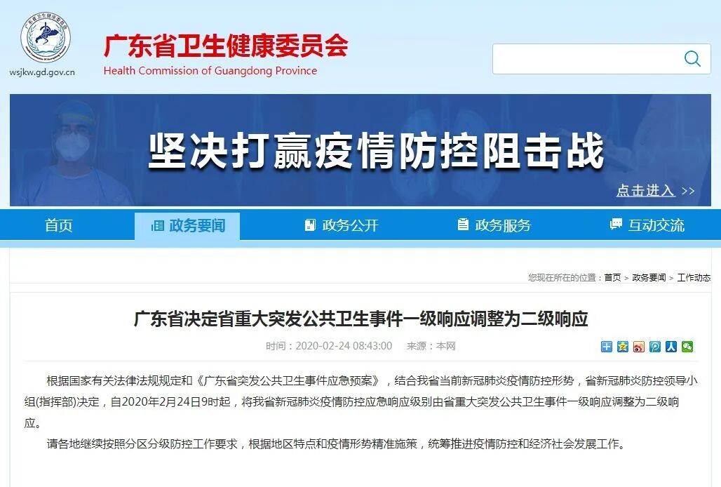 根据国家有关法律法规规定和《广东省突发公共卫生事件应急预案》,结合我省当前新冠肺炎疫情防控形势,省新冠肺炎防控领导小组(指挥部)决定,自2020年2月24日9时起,将我省新冠肺炎疫情防控应急响应级别由省重大突发公共卫生事件一级响应调整为二级响应。请各地继续按照分区分级防控工作要求,根据地区特点和疫情形势精准施策,统筹推进疫情防控和经济社会发展工作。来源:广东省卫生健康委官网