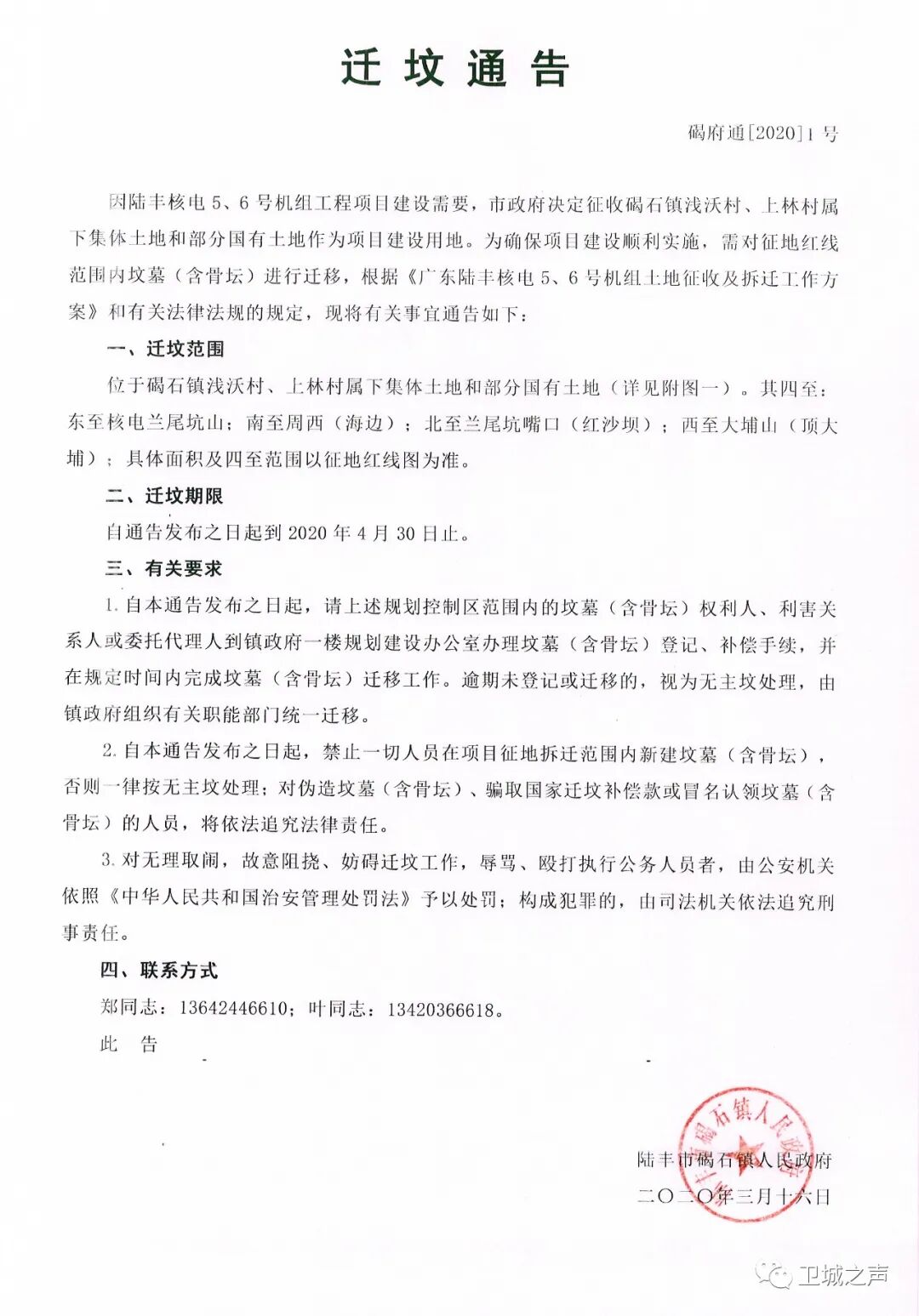 因陆丰核电5、6号机组工程项目建设需要,市政府决定征收碣石镇浅沃村、上林村属下集体土地和部分国有土地作为项目建设用地。为确保项目建设顺利实施,需对征地红线范围内坟墓(含骨坛)进行迁移,根据《广东陆丰核电5、6号机组土地征收及拆迁工作方案》和有关法律法规的规定,现将有关事宜通告如下: